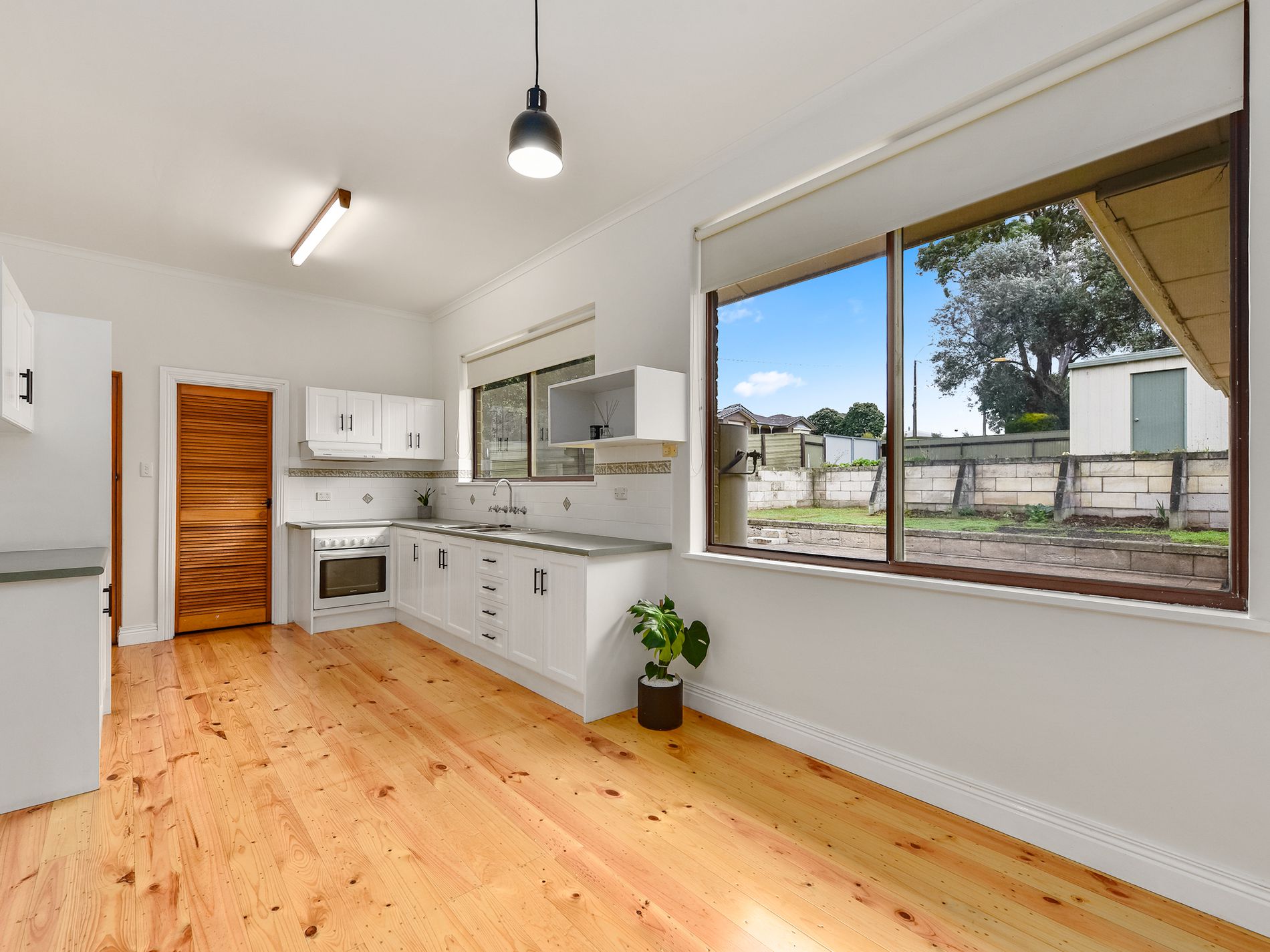 Again timber floors complement the white cabinetry and the cooking is electric. There is a huge walk in pantry for storage and to hide the clutter and large windows make the space light and bright.