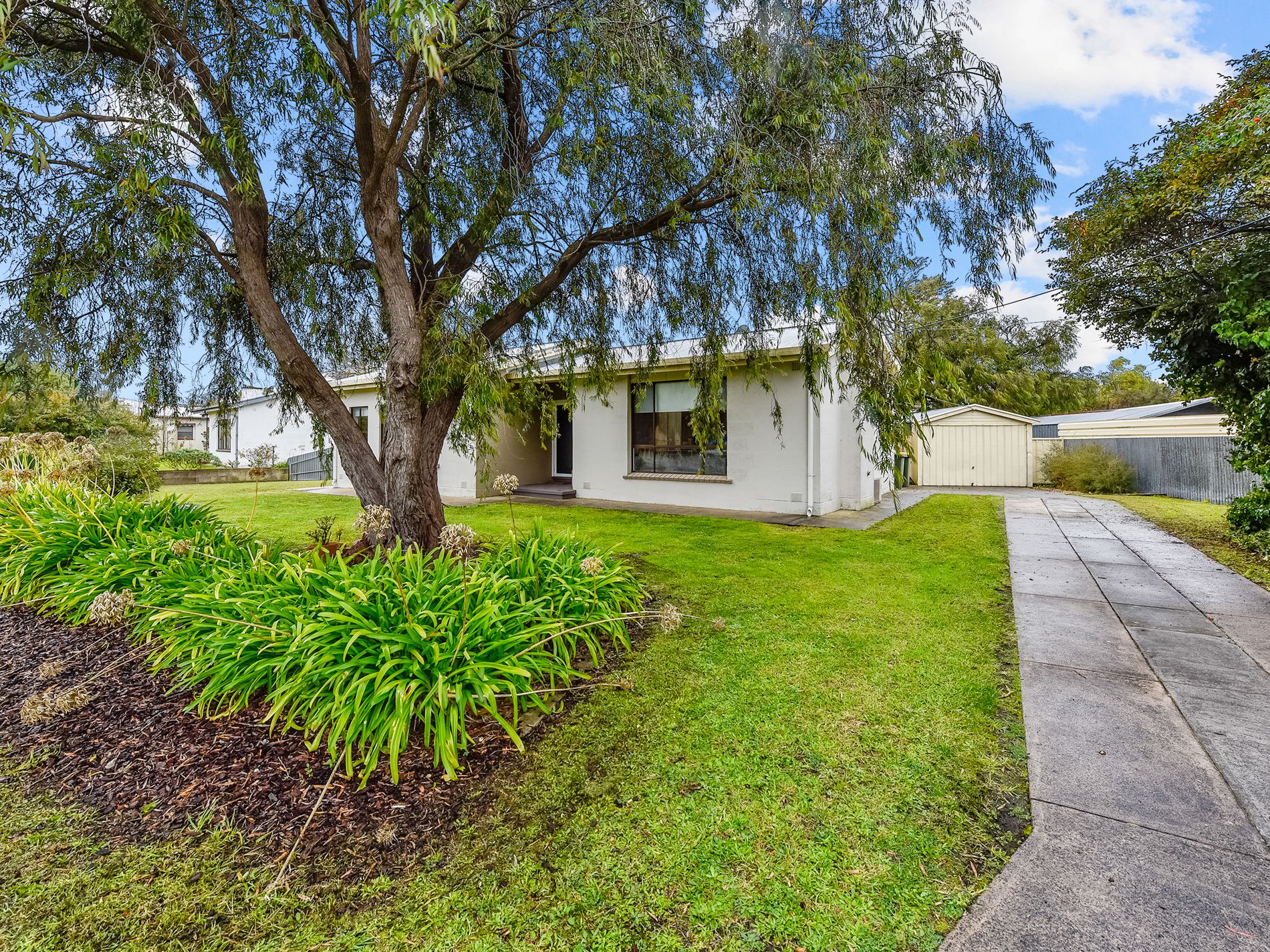 You have a single iron shed to the rear of the home with cement floor, accessed by the driveway.