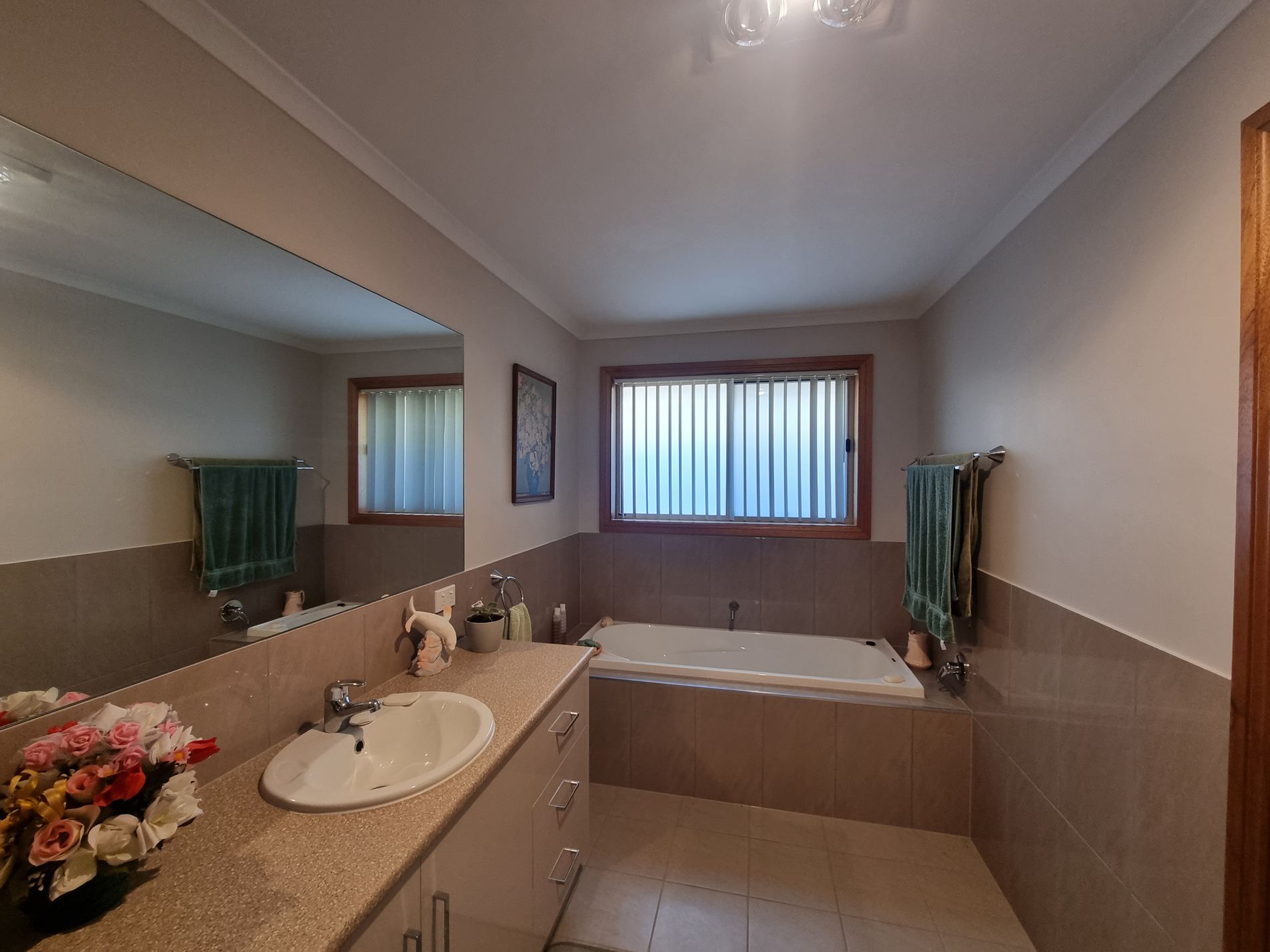 Two other bedrooms, all with carpet and vertical blinds, one with built in wardrobes. Large tiled main bathroom with separate shower, bath and vanity and heat lights. Separate toilet. Tiled laundry has built in cabinetry has, space for your washing machine and dryer with an access door to the side yard. A linen press in the hallway provides extra storage space. A ducted reverse cycle air conditioning system keeps the home warm in winter and cool in the summer.