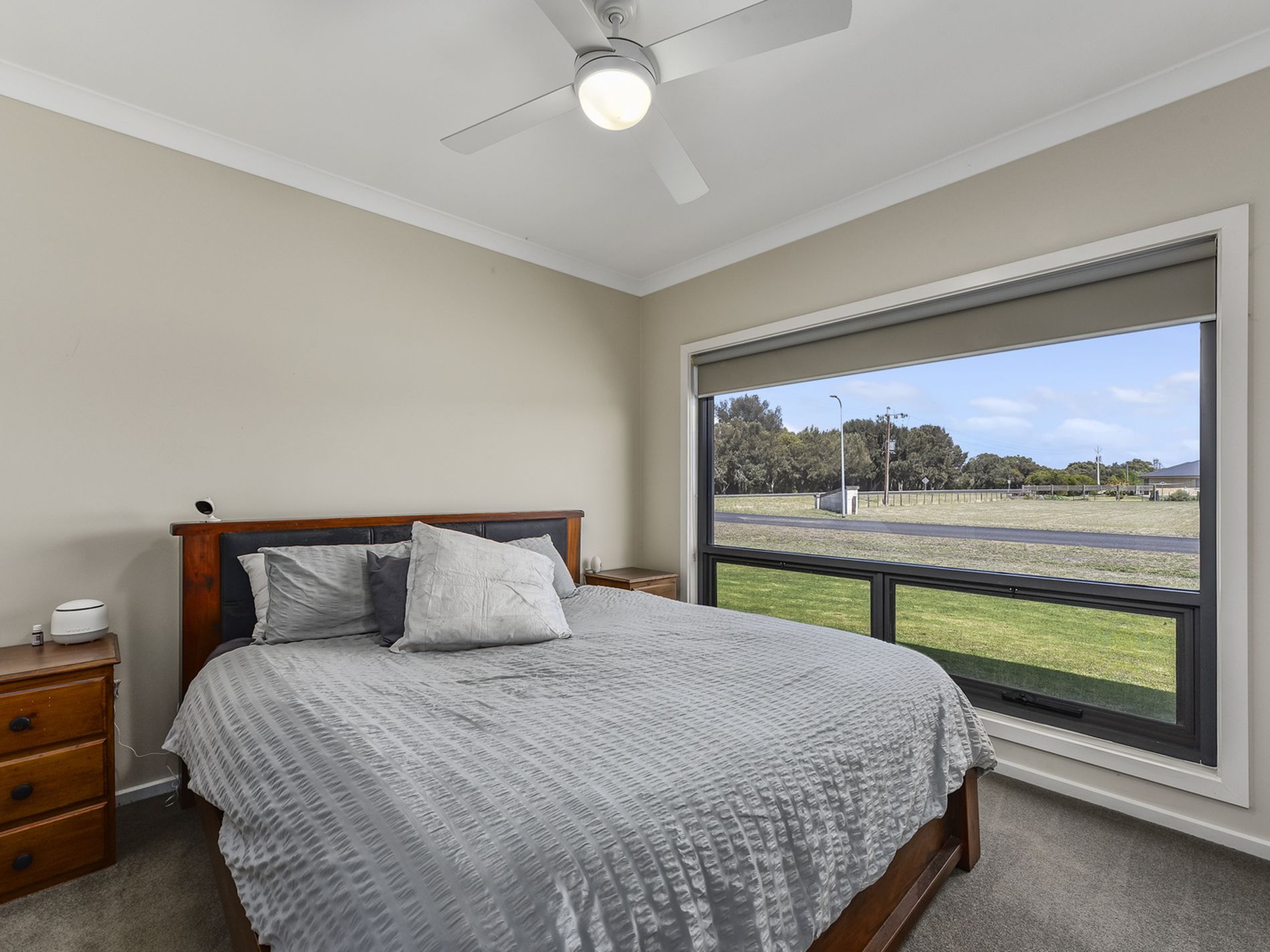 Carpeted Main bedroom with ensuite and WIR, ceiling fan and roller blinds in bedrooms. Two other bedrooms are carpeted with built-in wardrobes.