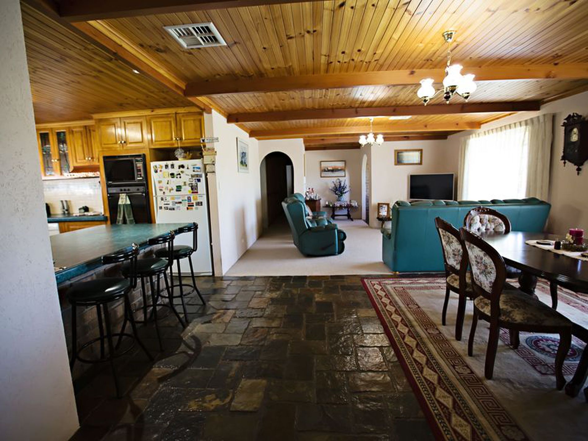 Enter into the front lounge and Open plan kitchen dining and living, colonial timber kitchen offering a walk-in pantry, Electric H/Ps & fan forced oven, dishwasher and slate flooring