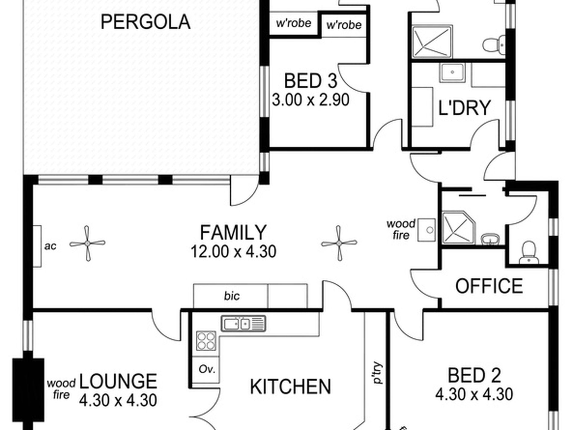 The carpeted family room of 12 metres has a r/c aircon and wood burner plus 2 ceiling fans. This room is extremely versatile with one end suitable for closing off for another bedroom. Adjacent to the family room is a small office/sewing room with cupboards. Also off this room is the large laundry and bathroom comprising toilet shower and basin.