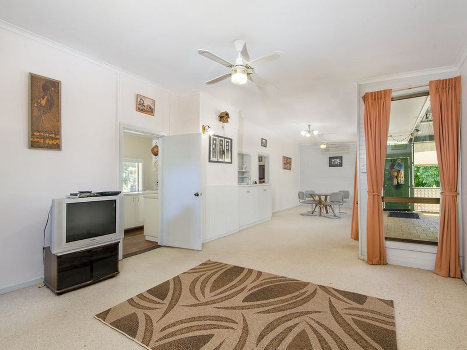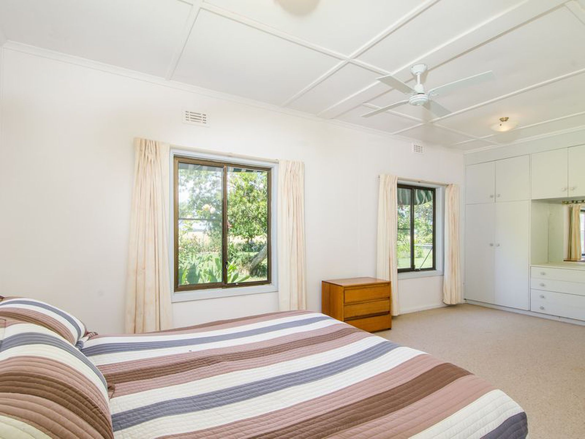 The main bedroom of 6.5 metres has a ceiling fan, 3 windows and 2 sets of built-ins and was at one stage converted to 2 bedrooms. The bathroom comprising shower, vanity and toilet is adjacent as is another bedroom large enough to accommodate a queen bed. This room is complete with built ins.