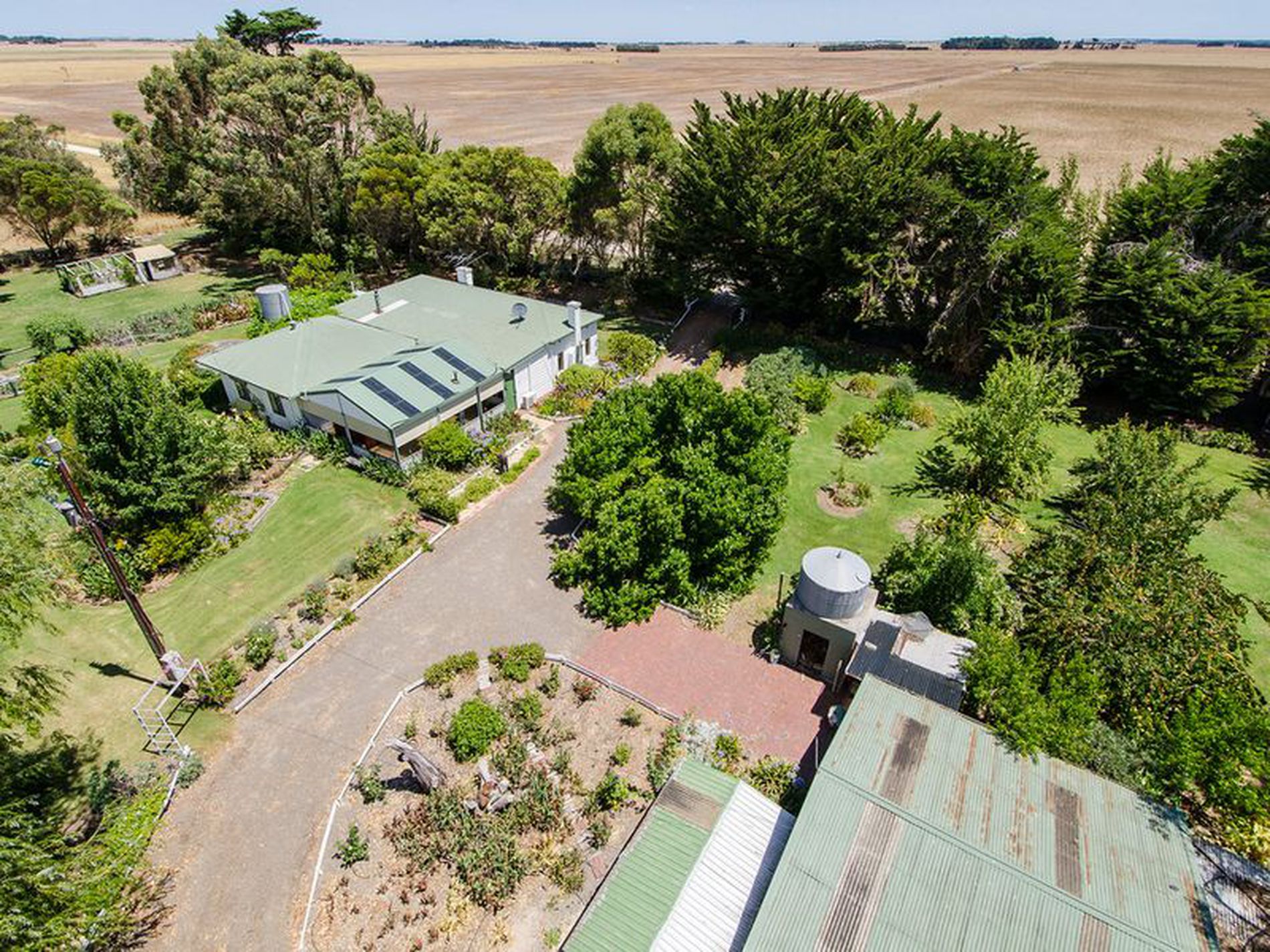 Approximately 5,000 gallons of rainwater in tanks plus a bore with a submersible pump provides constant water of spring quality. The lawns are watered by 23 in ground sprinklers.