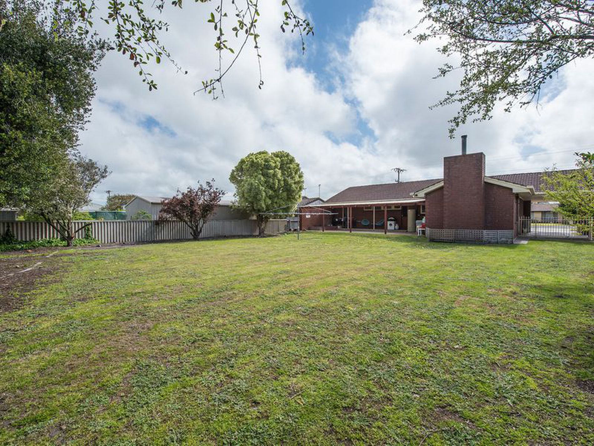 Garden shed and established trees frame and back rear enclosed yard
