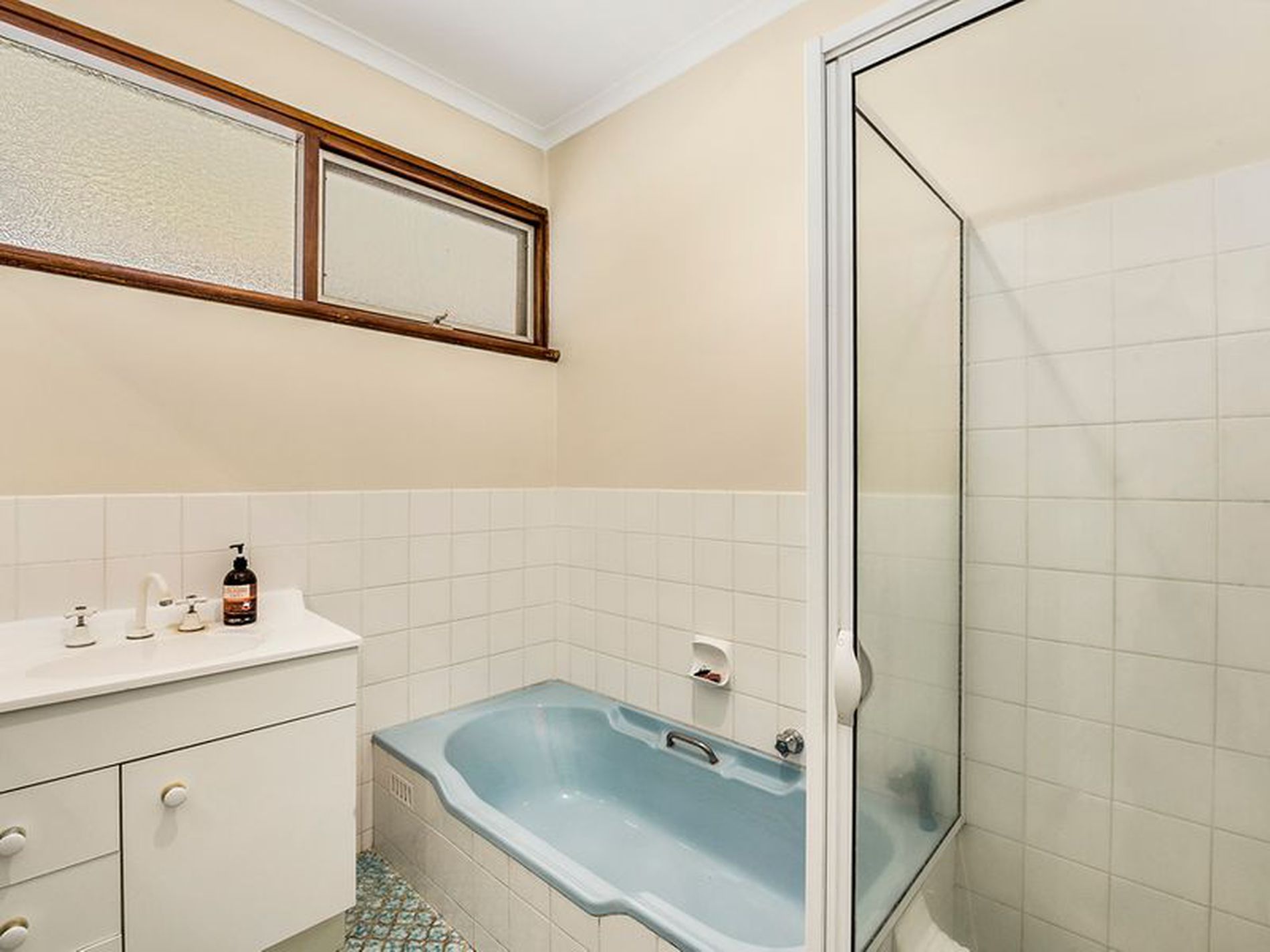 Bathroom is white, clean and has separate shower and bath with vanity. Separate Toilet