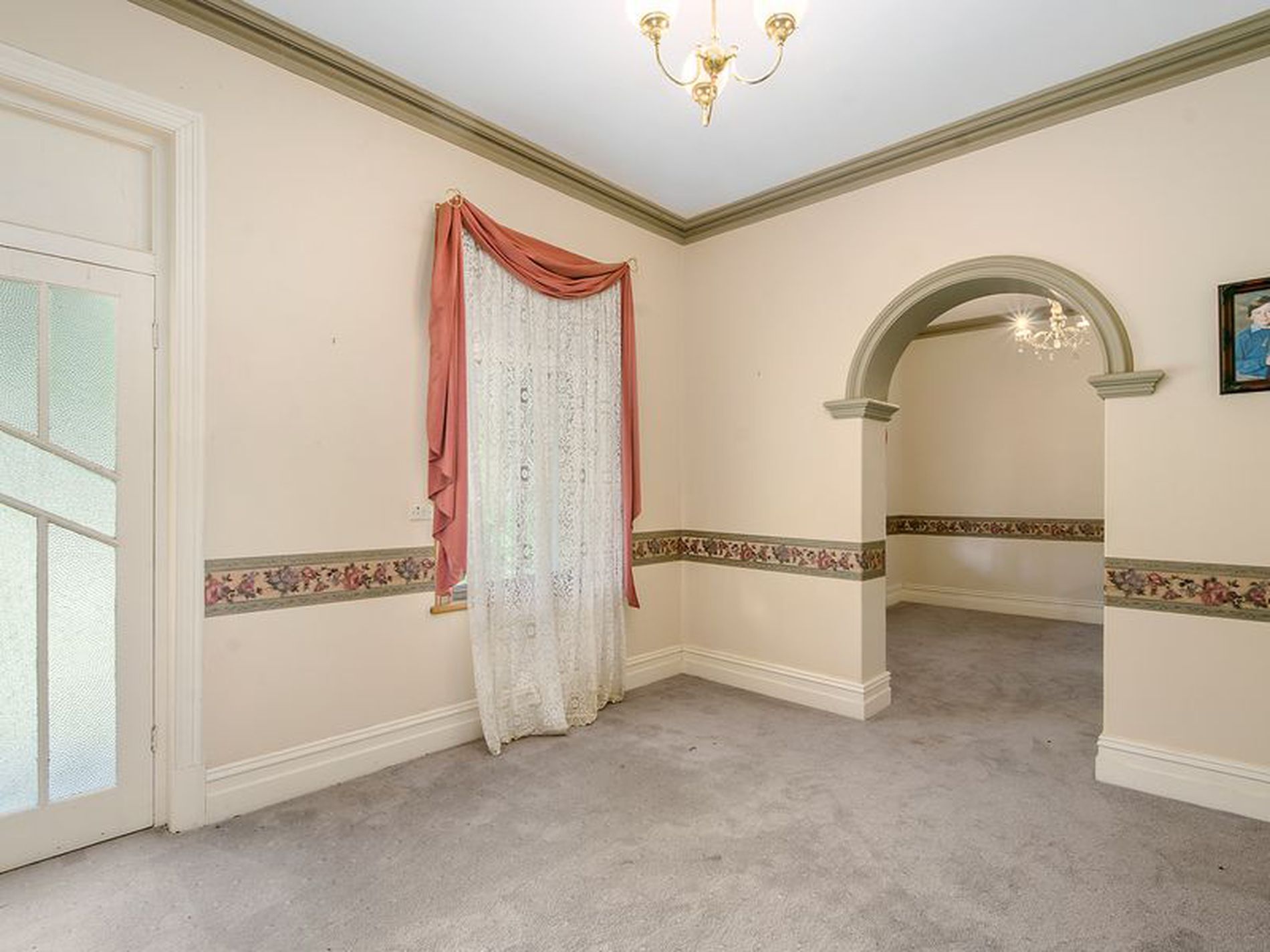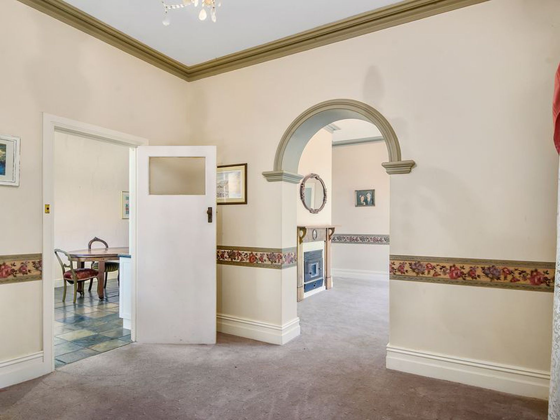 Formal front cosy sitting room with combustion fire and adjacent to formal dining room.
