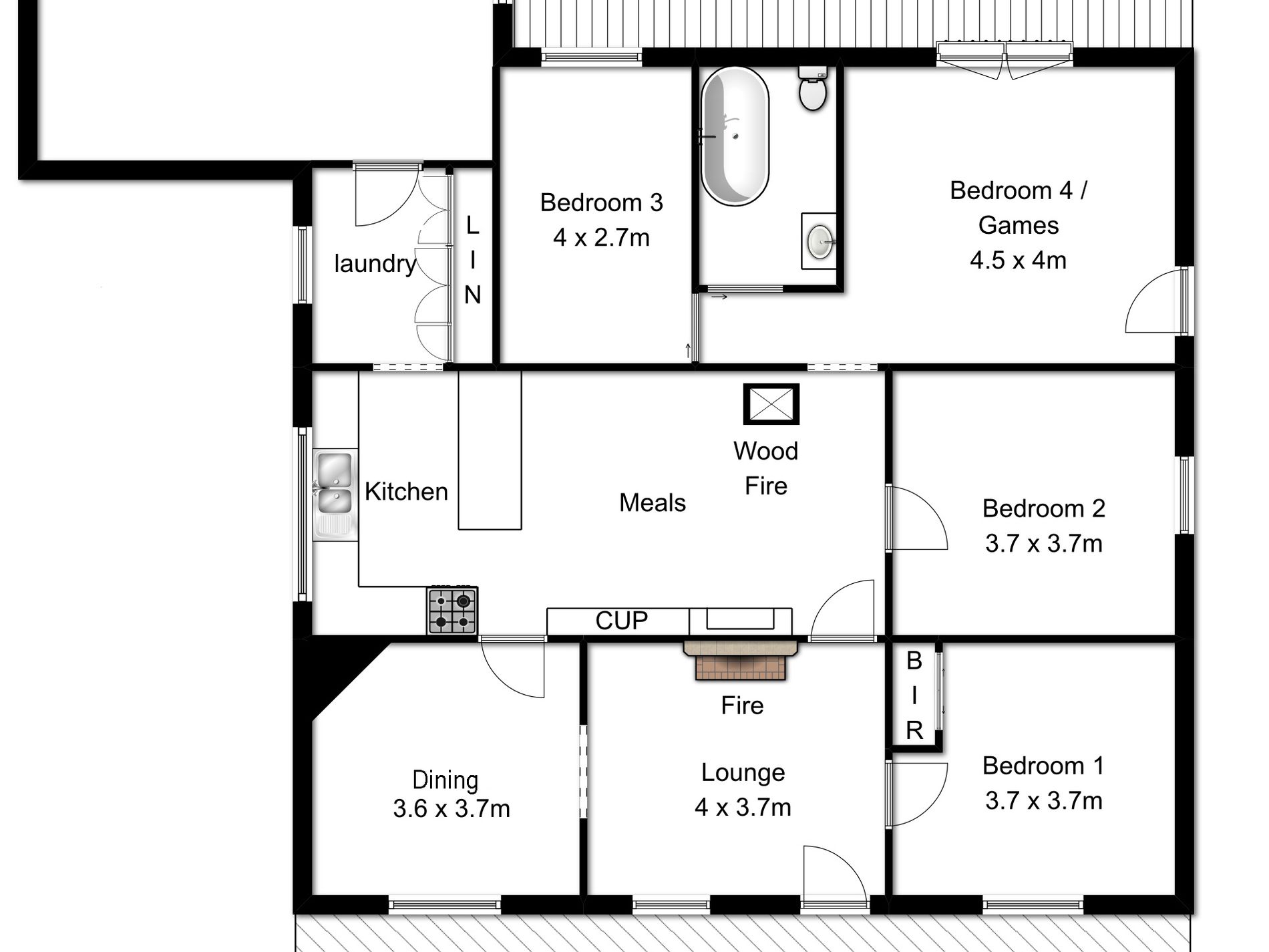 Games or lounge room [even extra bedroom is required] is 4.5 x 4m with French timber doors and undercover walkway to other external living retreat/flat