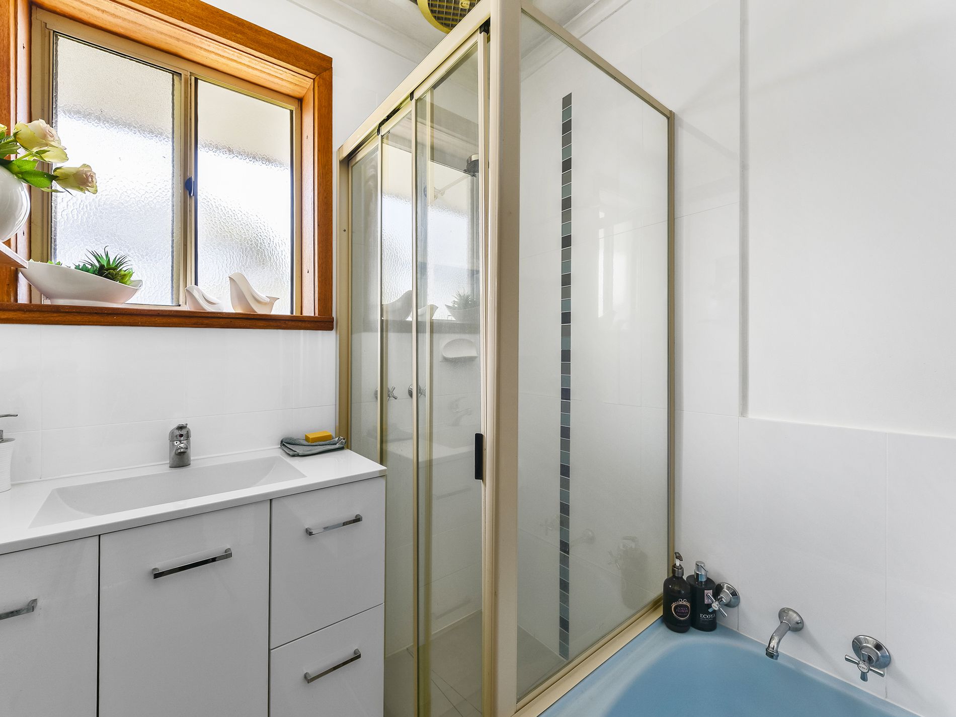 The tiled bathroom has been updated and has a separate shower with screen, bath, and a vanity. The toilet is separate, and the laundry is tiled and has a rear door.
