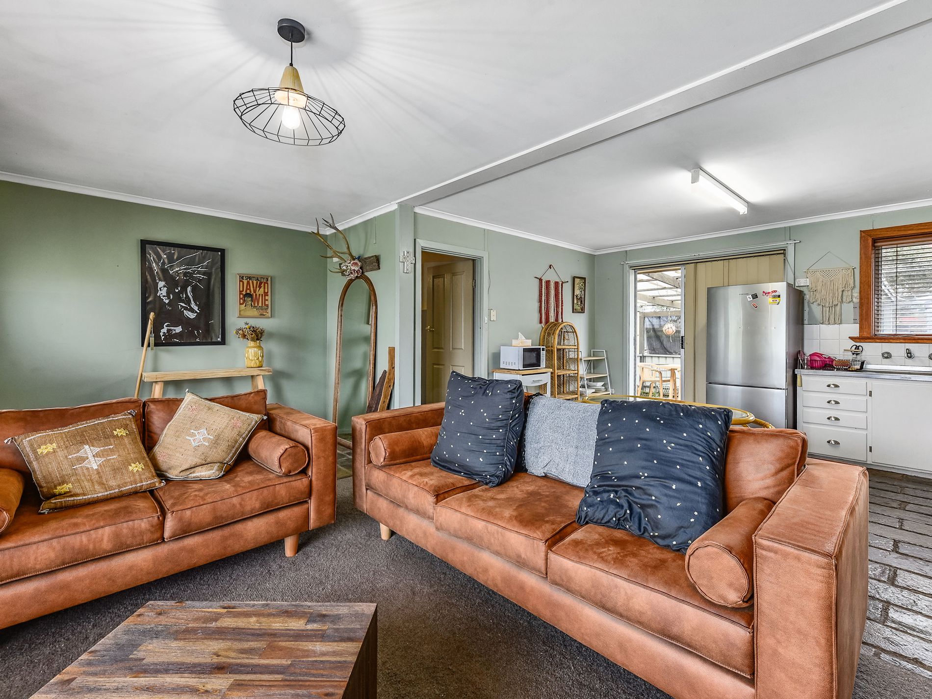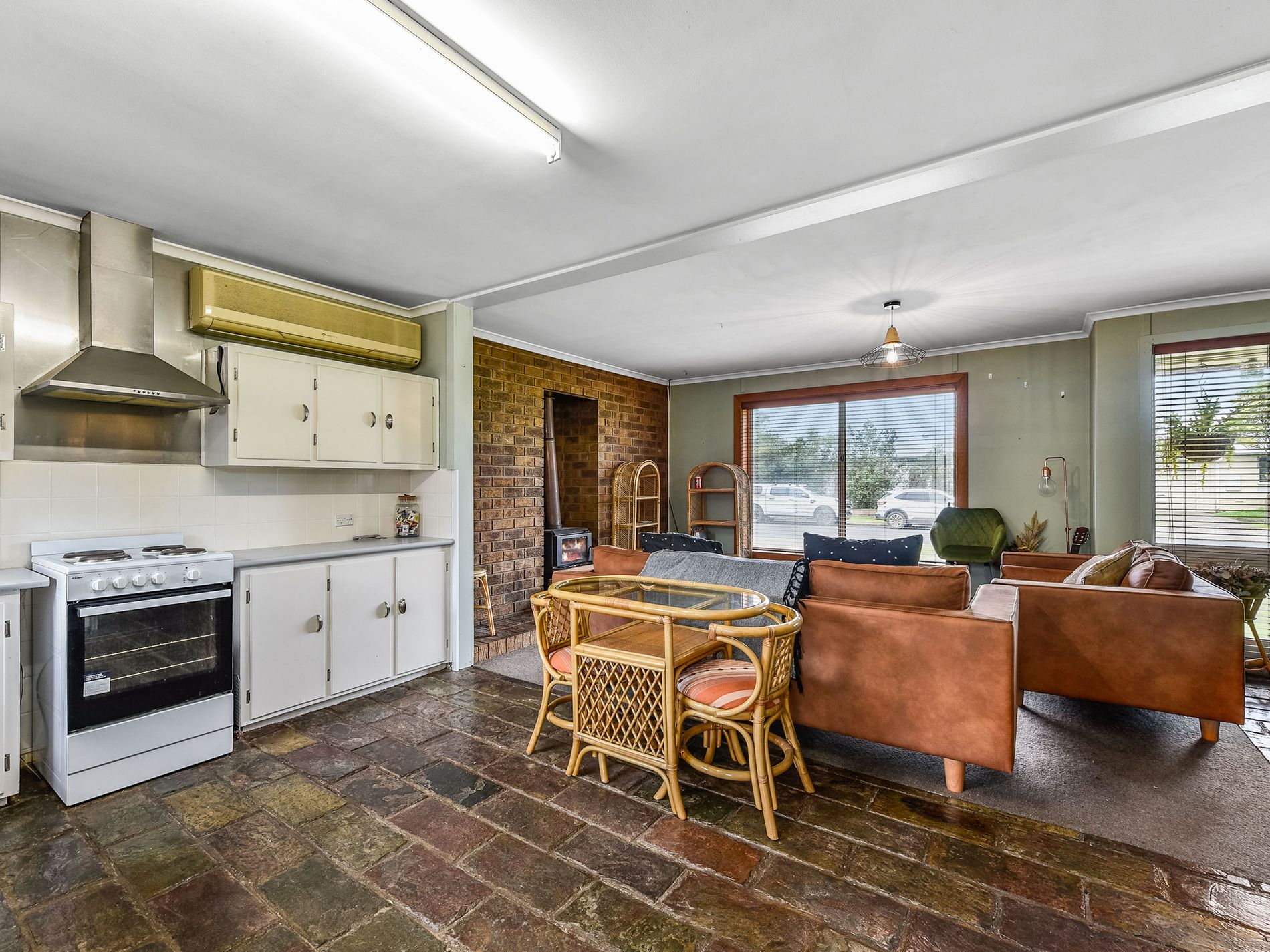 Open plan kitchen, dining, living with reverse cycle air conditioning, the entry and kitchen has a lovely slate floor while the living area is carpeted with blinds.