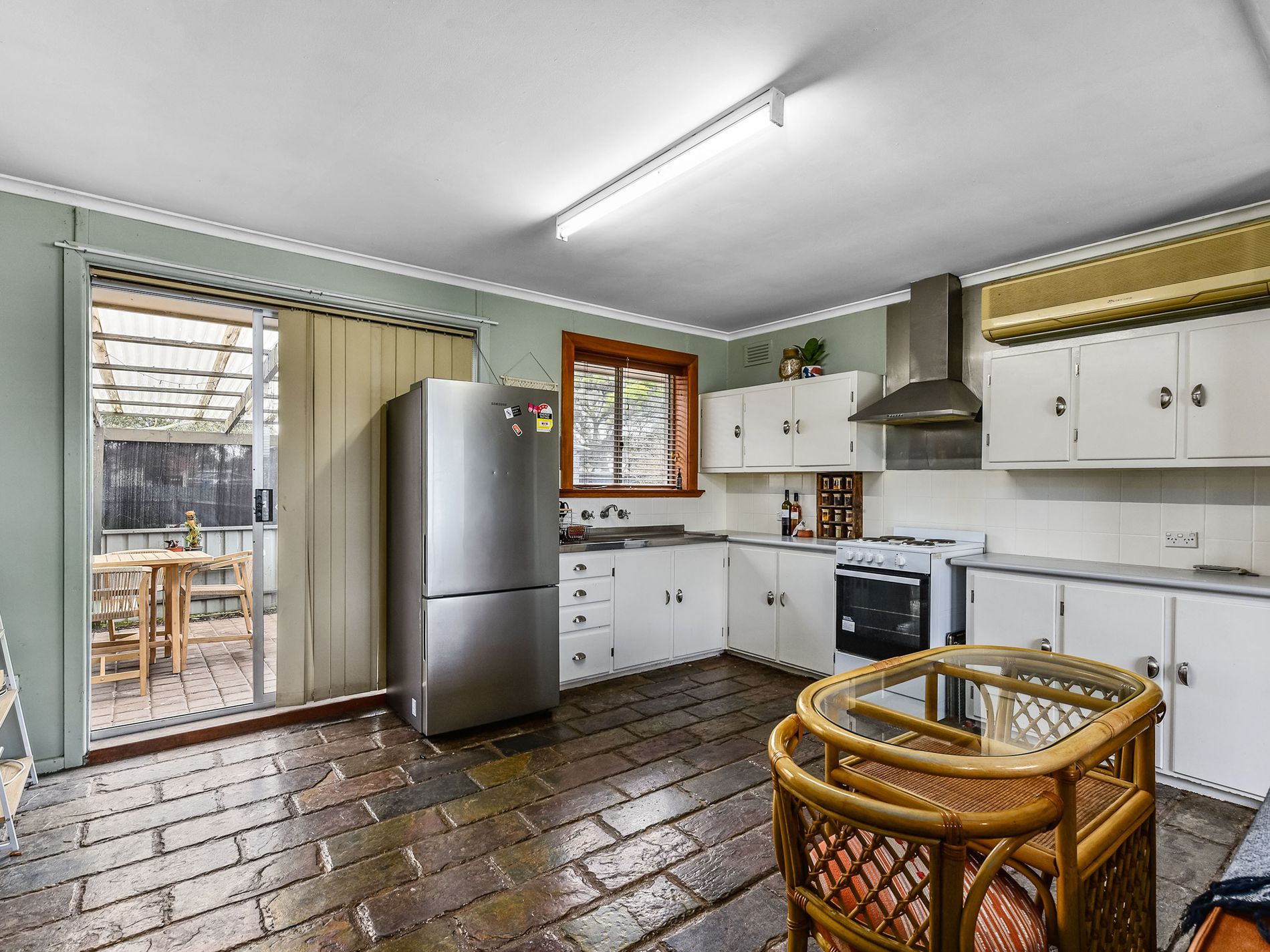 The kitchen has electric cooking, range hood and open dining. Sliding doors from here lead out into the semi enclosed rear pergola.