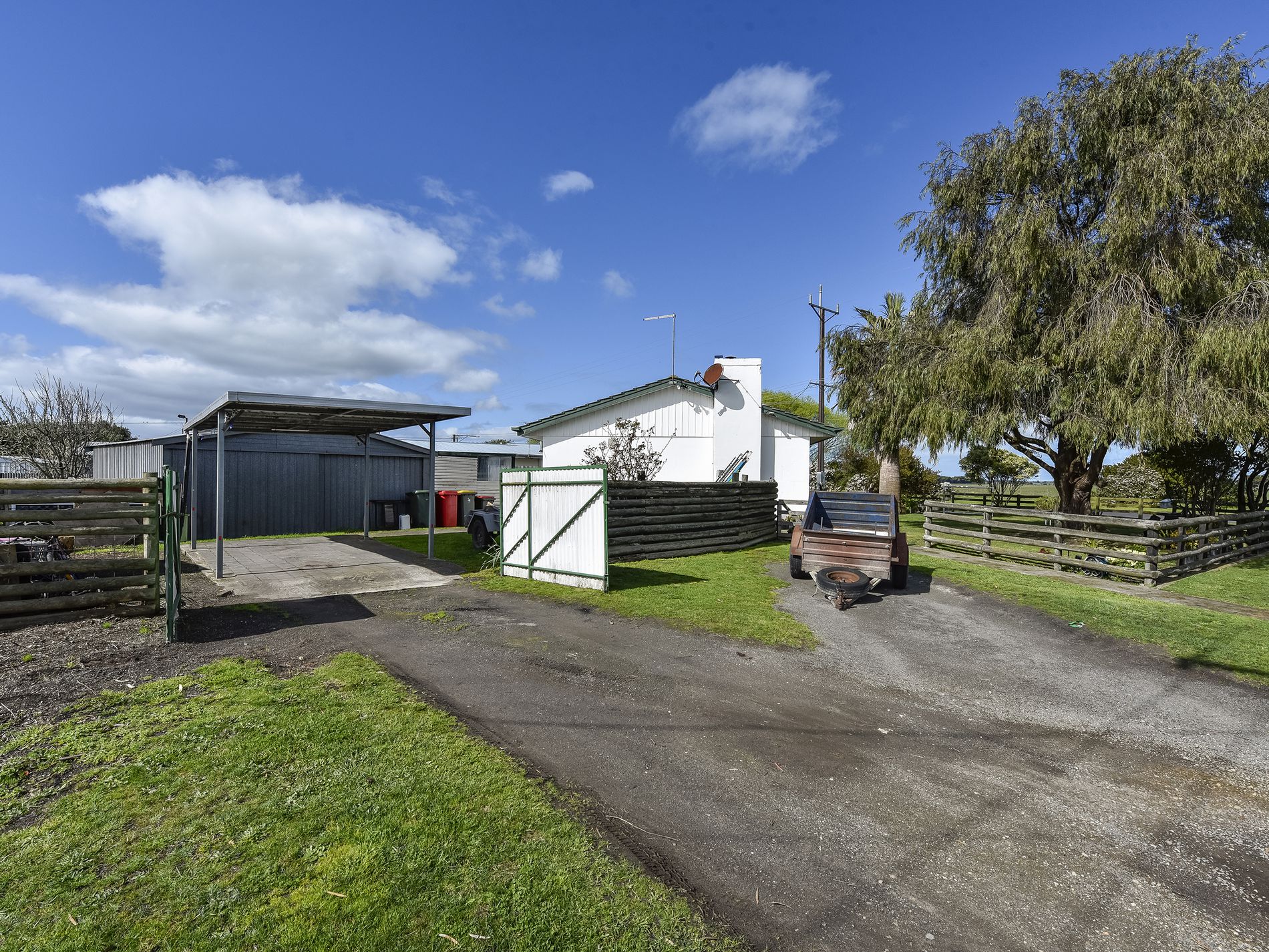 The rear yard is enclosed with a single iron shed with cement floor. A single car open carport to park under.