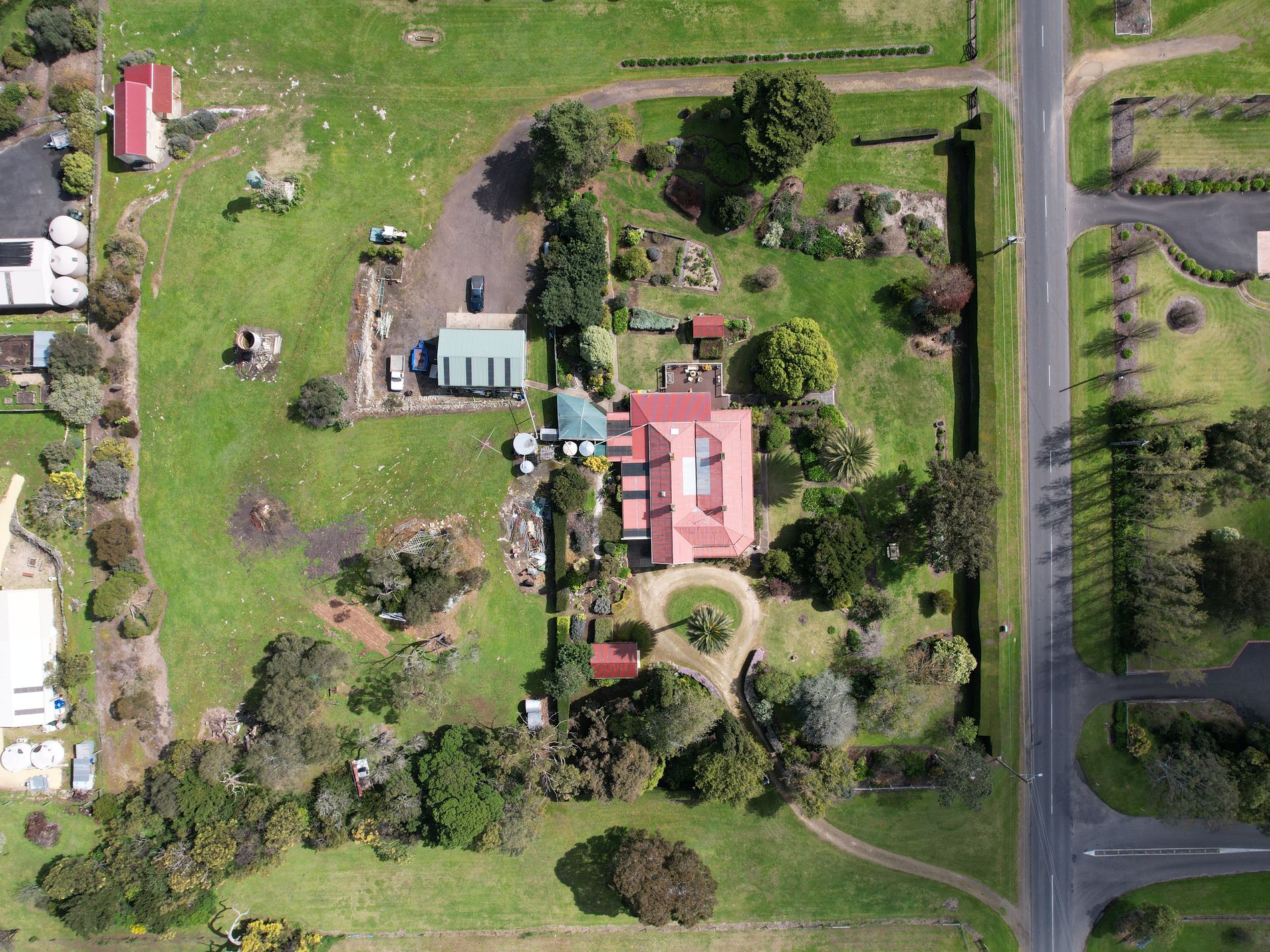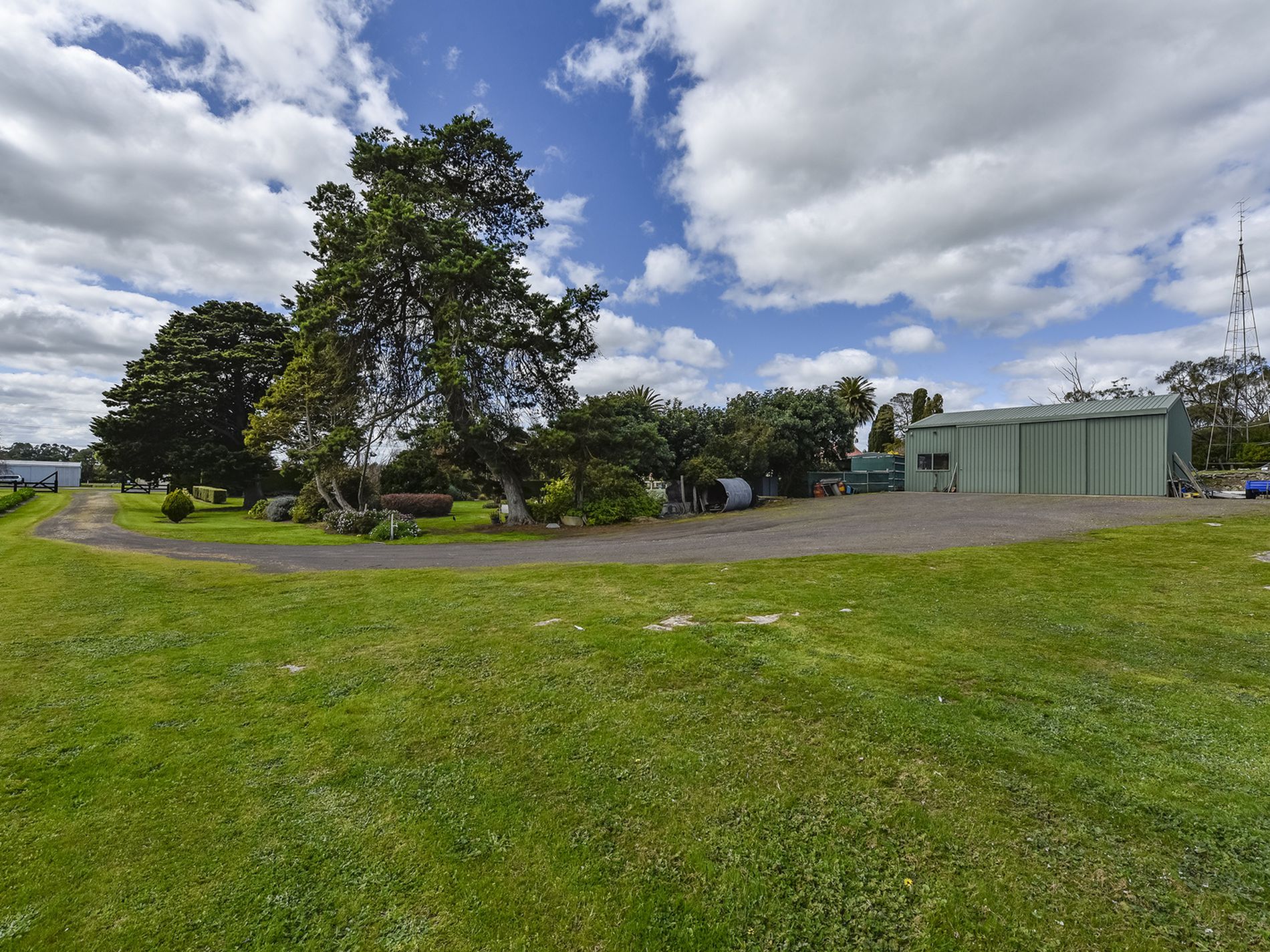 There is a four bay shed with workshop with 3 high clearance doors. mezzanine storage and it is insulated. other outbuildings include a stone storage shed and garden sheds. A pop up sprinkler system waters the garden from an equipped bore.