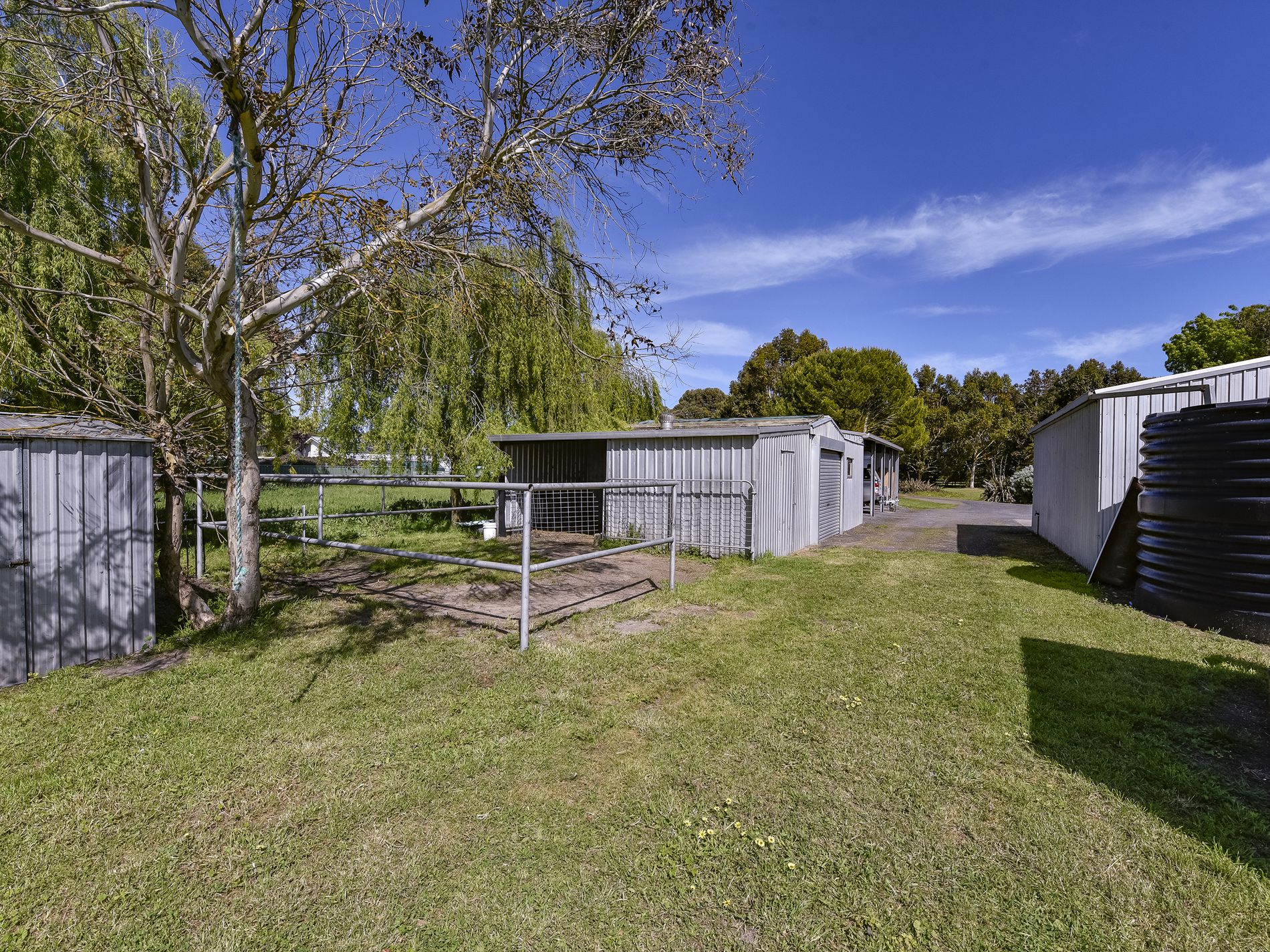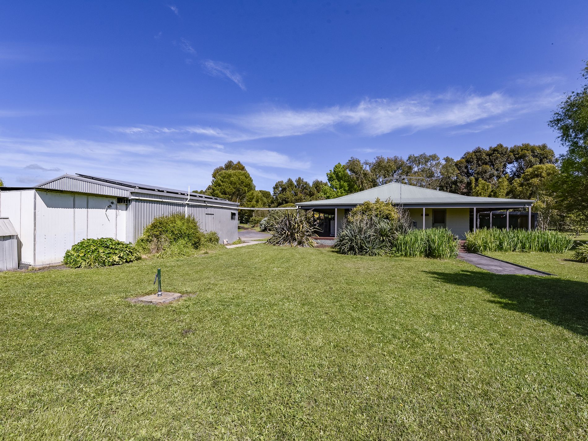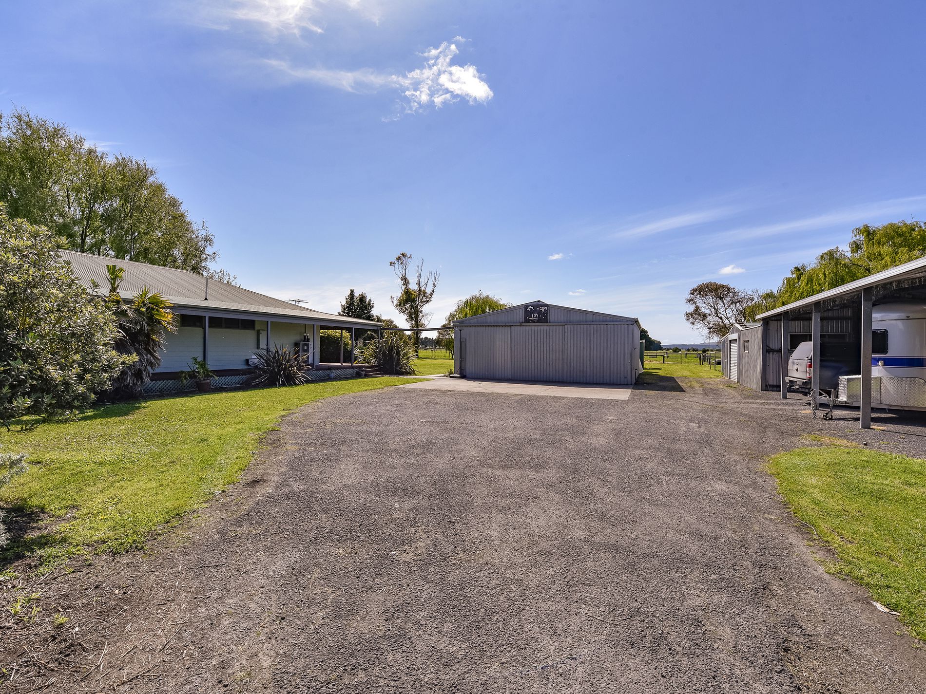 The home has three bedrooms plus an office / fourth bedroom. The master with huge walk-in robe. A newly renovated, large, tiled bathroom has a shower, corner spa bath and vanity, and a separate toilet. There is a large open plan Kitchen, dining and living space with beautiful, feature hardwood floors. A slow combustion heater here heats the whole home and you also have a ducted reverse cycle heating and cooling system for year round comfort. The kitchen has electric cooking and large walk-in pantry to hide away all of the kitchen clutter. You will actually enjoy doing the dishes at the kitchen sink set in a lovely bay window overlooking farmland. A sliding door from the living space leads out to the side entry/sunroom and verandah with steps down to a pergola area which is adjacent an enclosed fern garden. The office/fourth bedroom is also accessed from the sunroom. The shedding is fantastic and every mans dream, a driveway leads to a four-bay iron, open front car shed which joins a lockable workshop and car shed. A second 12m x 12m iron shed also has room for cars plus a full bathroom, storeroom, and an old cool room( not functioning). To the rear of the house yard sits a large hay shed, there is a stable, a tack room / storage room plus a woodshed. Water to the house is rainwater and the yard and paddocks are services by a bore. There are some fruit trees and plenty of space to create an orchard and extensive veggie patch to grow your own produce and become self sufficient. You also have a solar system installed reducing your electricity bills.