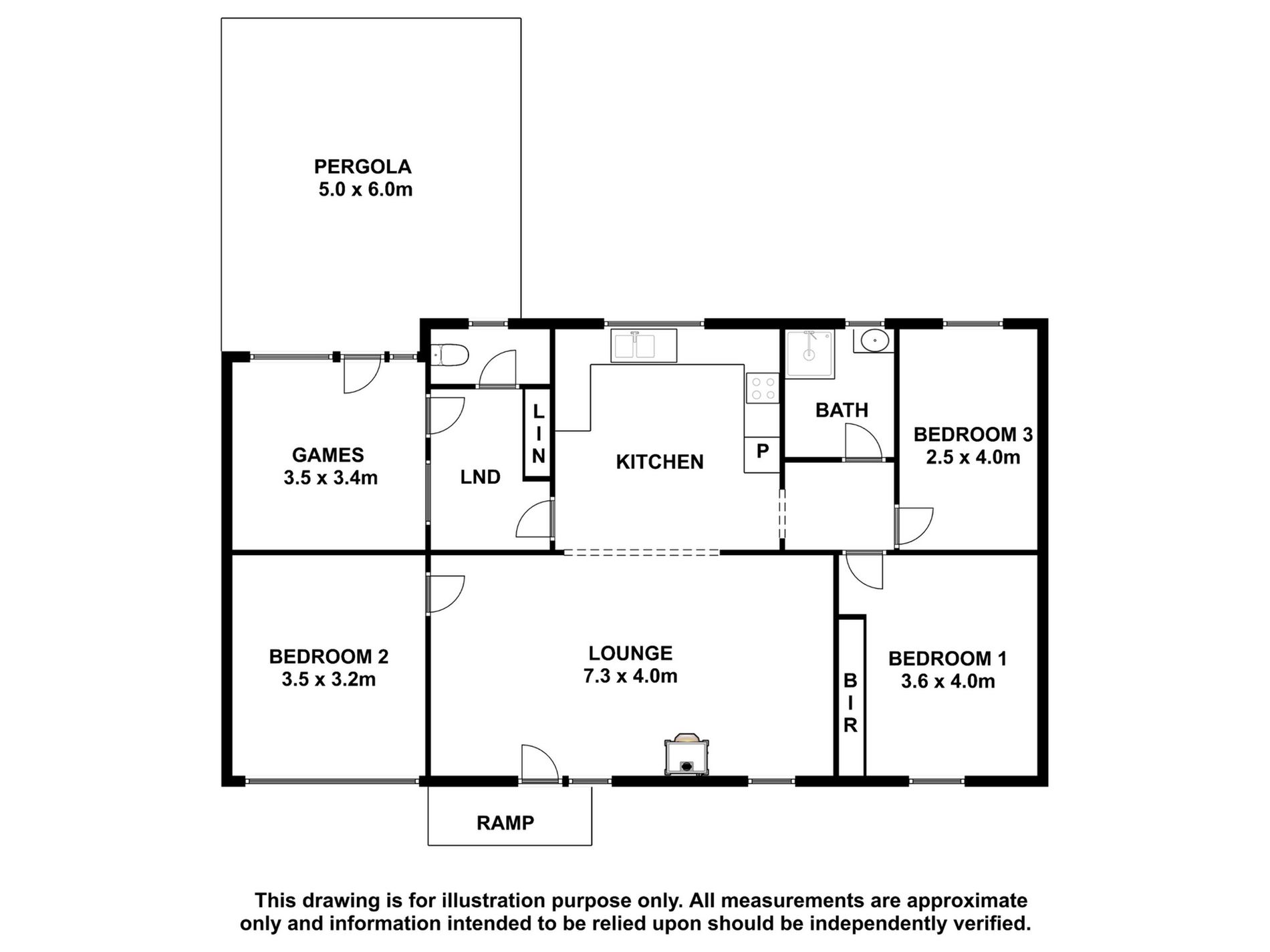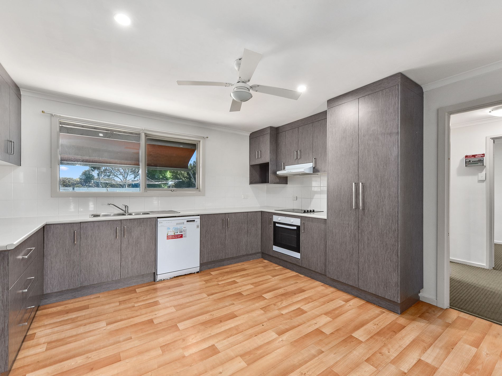 Off to the right of the kitchen, a small hallway leads to two generously sized double bedrooms and a tiled bathroom with a shower and vanity. The third bedroom is located off the lounge, while on the left of the kitchen, you'll find a large laundry/mudroom area with a step-down to a versatile second living space, perfect for children's activities.