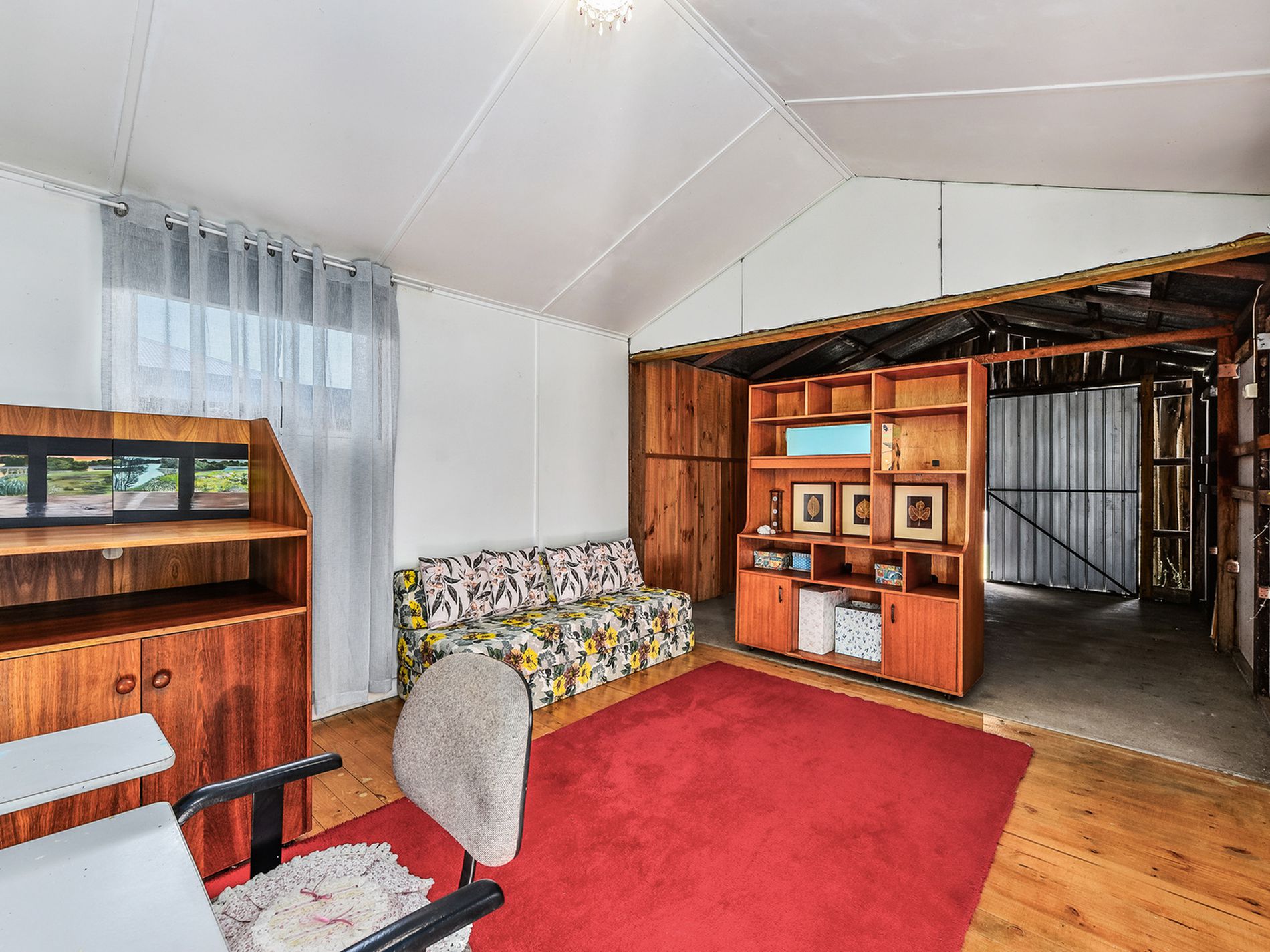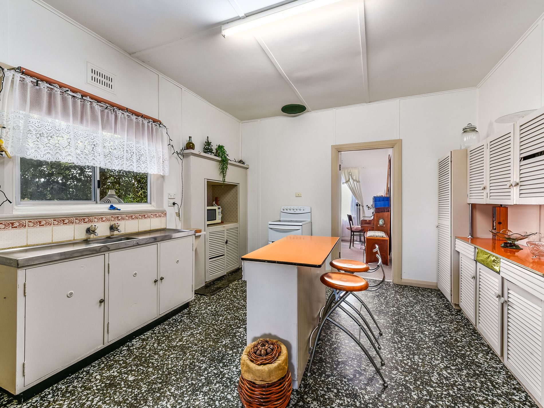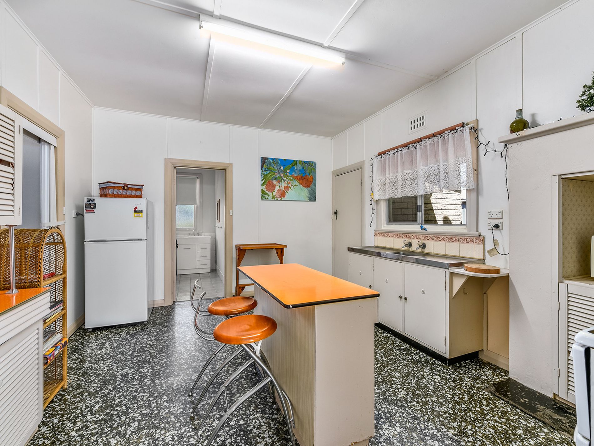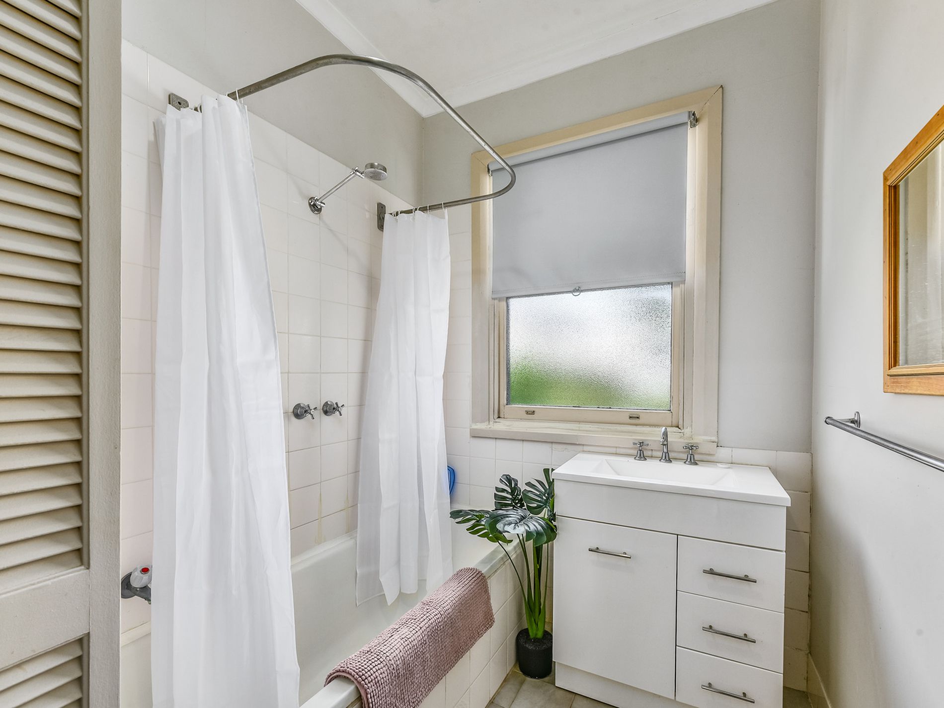 Original kitchen with electric freestanding oven, island bench and plenty of storage along with dining space in the kitchen. This is a practical and easy to use-space for cooking at home. The tiled bathroom is located off the kitchen, that has been upgraded with shower over bath and freestanding vanity. The toilet and laundry are seperate.
