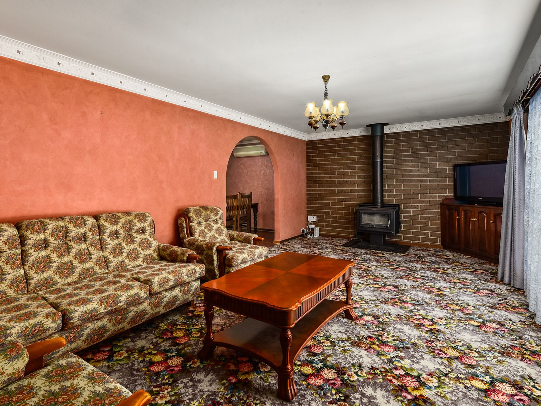 Entry through the front door is into an entry hall with the large lounge room to the right. The lounge is carpeted and has curtains on the windows with lovely views out to the established gardens. It is heated by a slow combustion wood heater, this keeps the whole home warm and toasty over the cold, wet winter months. An open plan kitchen, dining is adjacent and has electric cooking with wall oven and cook top. There is a double sink and an exhaust fan and it has timber look laminate floors. Sliding doors from here take you to the rear verandah which joins the carport attached to the home. A reverse cycle air conditioner is also here to cool the area on those hot summer days.