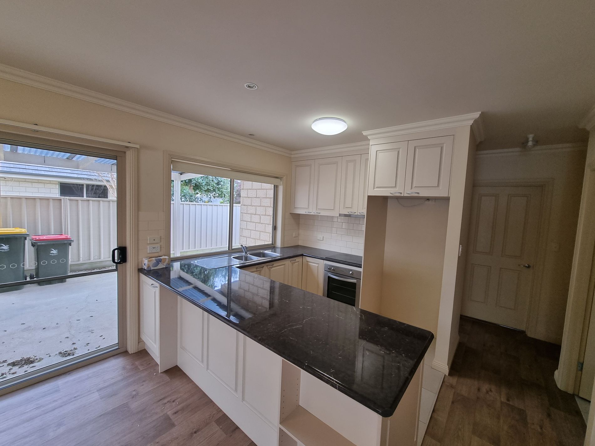 Open plan Kitchen with breakfast bench, Dining & Living areas with sliding door access to pergola