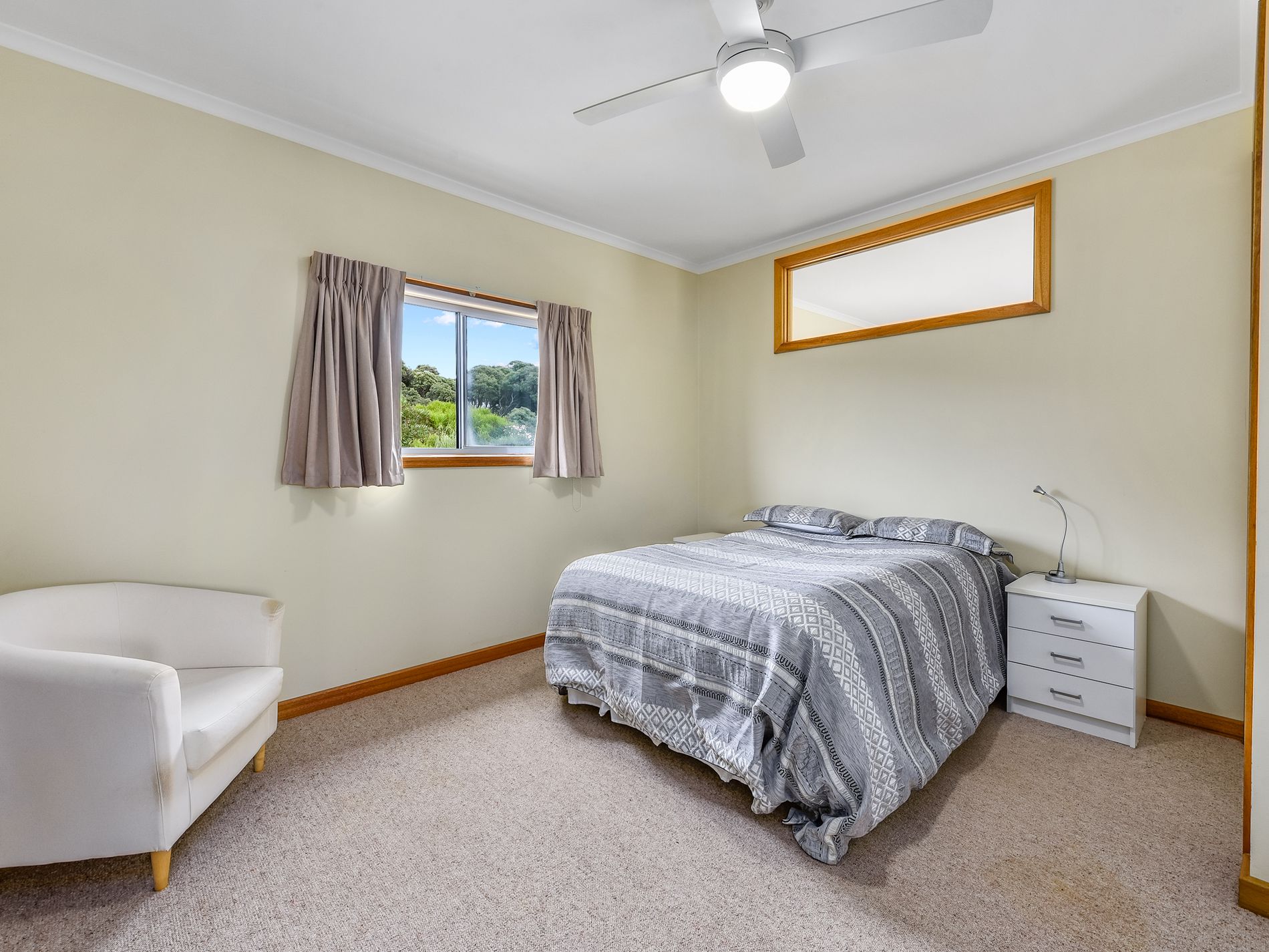 The home features 2 large bedrooms with carpets, curtains, and ceiling fan. Both rooms also include built-in-robes.