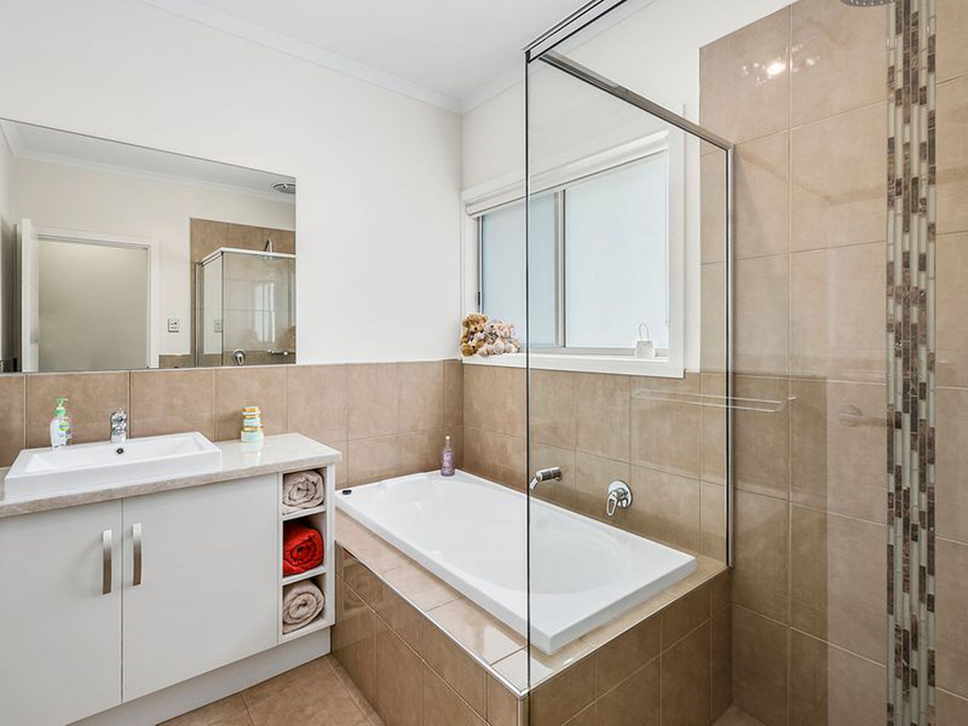 Master bedroom is carpeted and day/night blinds plus enjoys a nice backyard outlook with walk through wardrobe to a very classy ensuite. with large shower, double vanity, toilet, and heat lamps and exhaust fan
