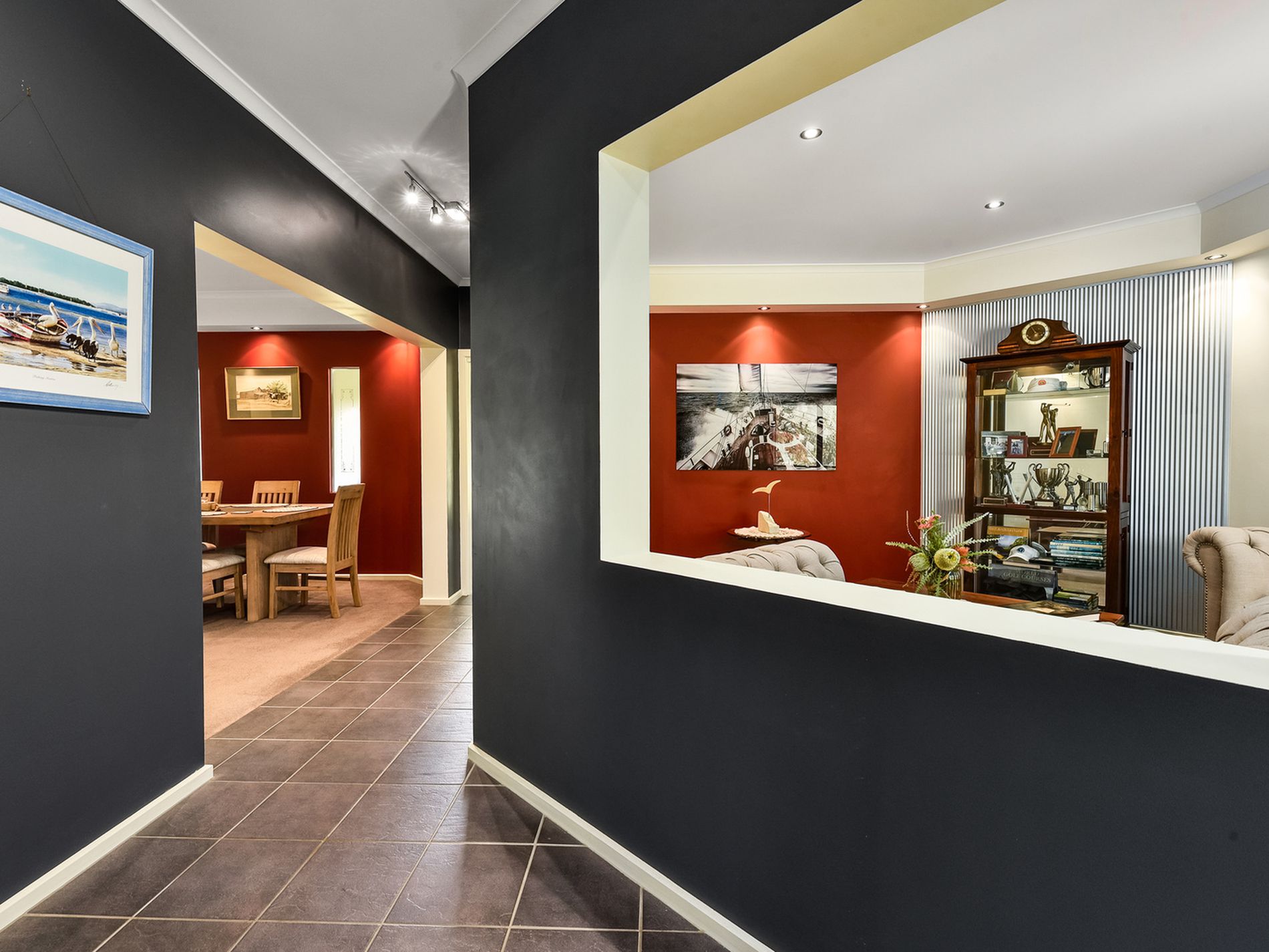 Adjacent is the formal lounge room with iron Orb feature wall and across the hall is the formal dining room, with plenty of room for a large table, and feature windows to let in natural light. From here you enter the large family room. Movie nights will be a favourite in here with built in surround sound and space for a huge television on the feature iron orb wall.