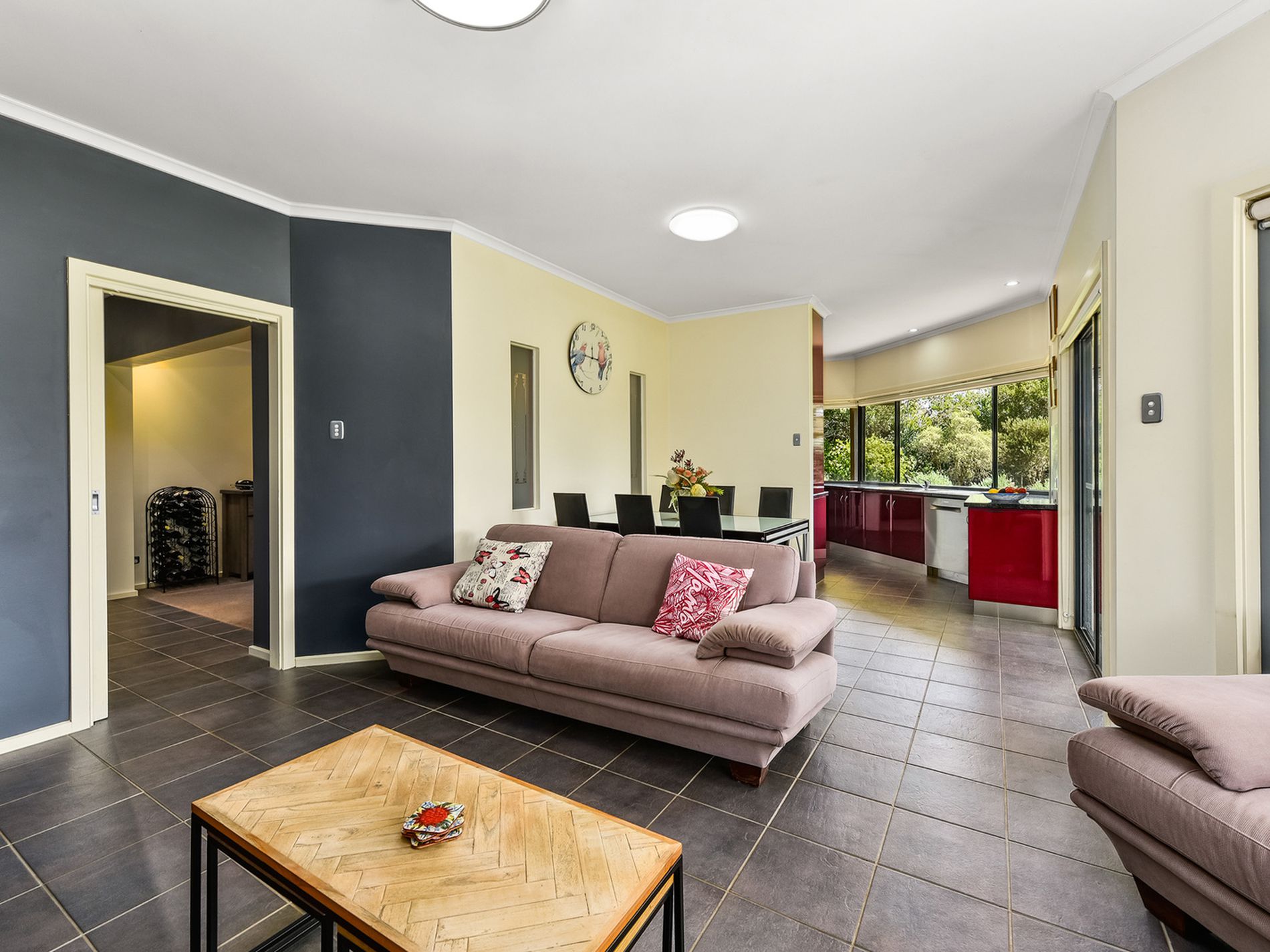 Opening to the kitchen is the open plan casual dining and living space. This area is tiled and has sliding door access to the rear pergola. Imagine yourself here with your morning coffee listening to the birds, or enjoying a sneaky wine with family and friends while watching your kids run around the rear yard. The Coonara slow combustion wood fire makes this a cosy spot on cold winter days and warms the home. You also have four split system air conditioners that heat and cool the entire home.
