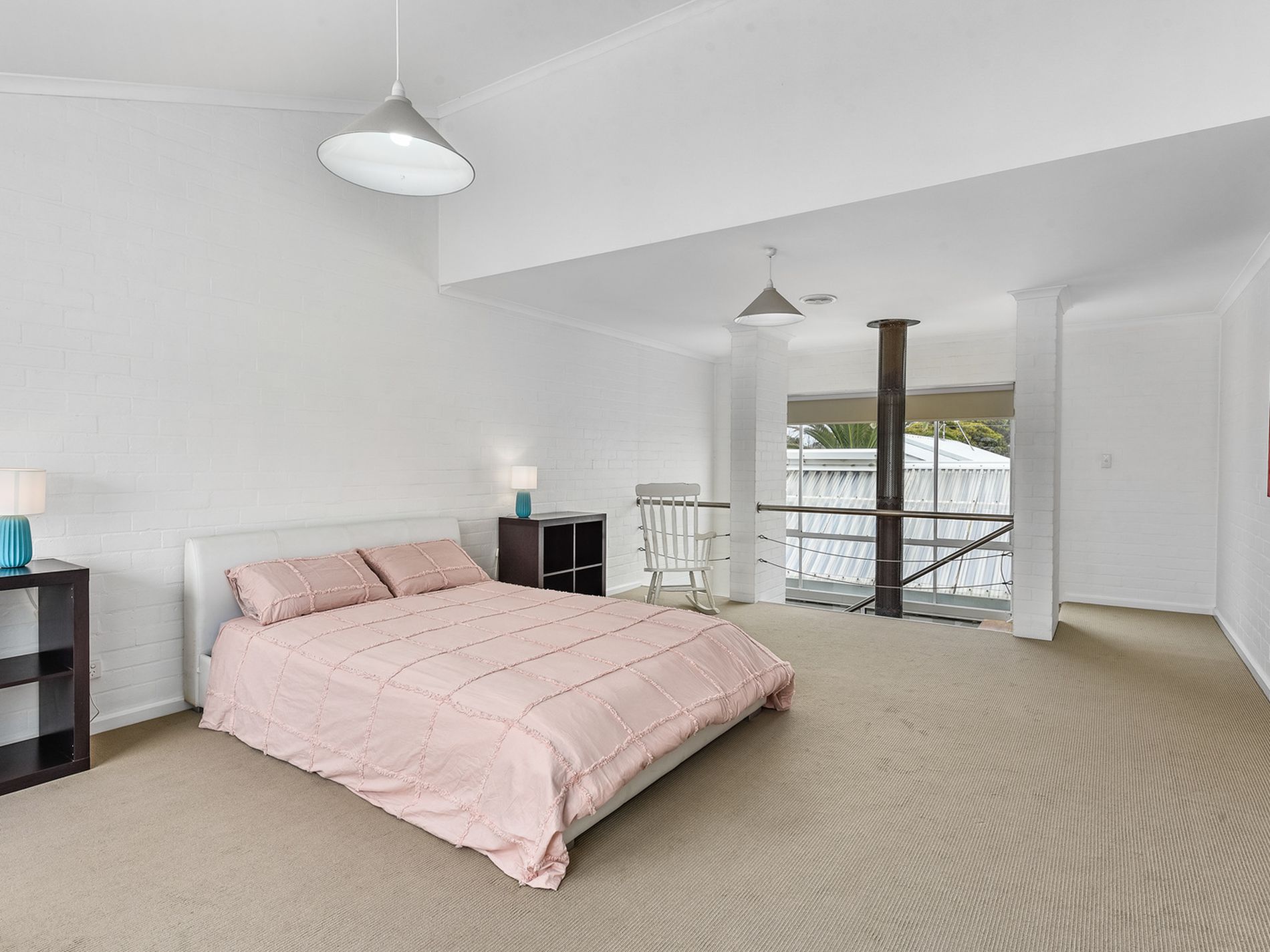 The lounge itself includes a centrally located freestanding wood fire, it overlooks the pergola separated by a wide-angled wooden staircase the leads to the upstairs bedroom with luxury ensuite bathroom and walk-in-robe. This is an amazing room that could easily be utilised as a large office or studio. Glimpses of the ocean, jetty, and fishing fleet are a bonus on this level.