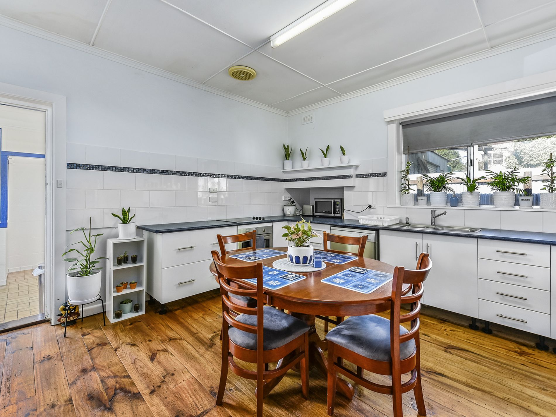Entry hall with original timber floorboards. To the left is a front carpeted lounge with a gas heater. There are three bedrooms, the master with carpet and ceiling fan. Bedroom two has polished boards and built-in cupboard without doors and bedroom three is carpeted. The tiled bathroom has a large shower and pedestal basin. The kitchen has been renovated with under bench oven, hotplates, and dishwasher. The rear sunroom leads out to the large tiled Laundry and Separate Toilet.