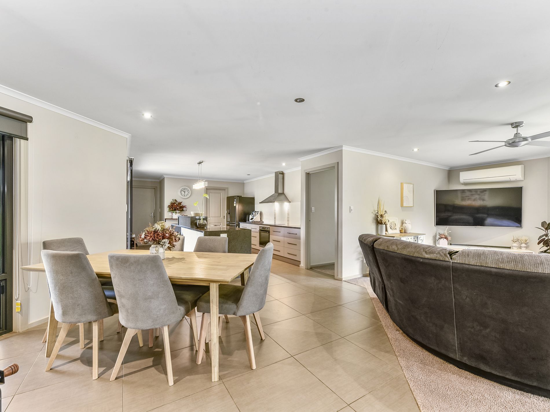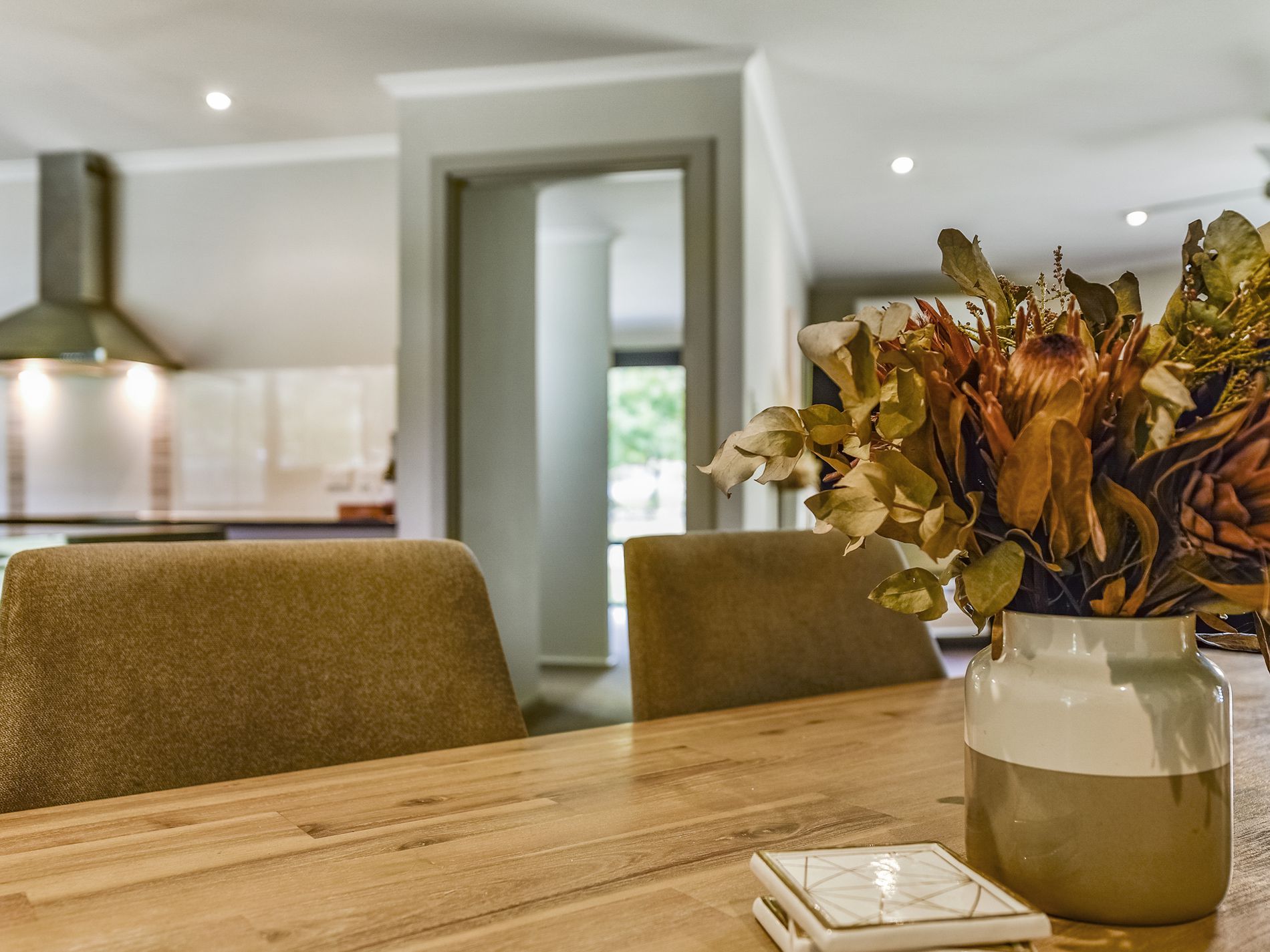 The interior of this modern lifestyle home features an open-concept design with a large living area, dining area, and a modern kitchen with high-quality appliances and fixtures. The layout is designed to maximize the use of space and to create a seamless flow between the different areas of the home. The kitchen is central and overlooks the amazing pergola with direct sliding door access. A long island bench houses the sink and dishwasher and there are plenty of drawers for storage. A large walk in pantry pprovides ample storage and cooking is electric. The dining area is tiled and a room divider creates another living space, an ideal office space or family room / kids play area.