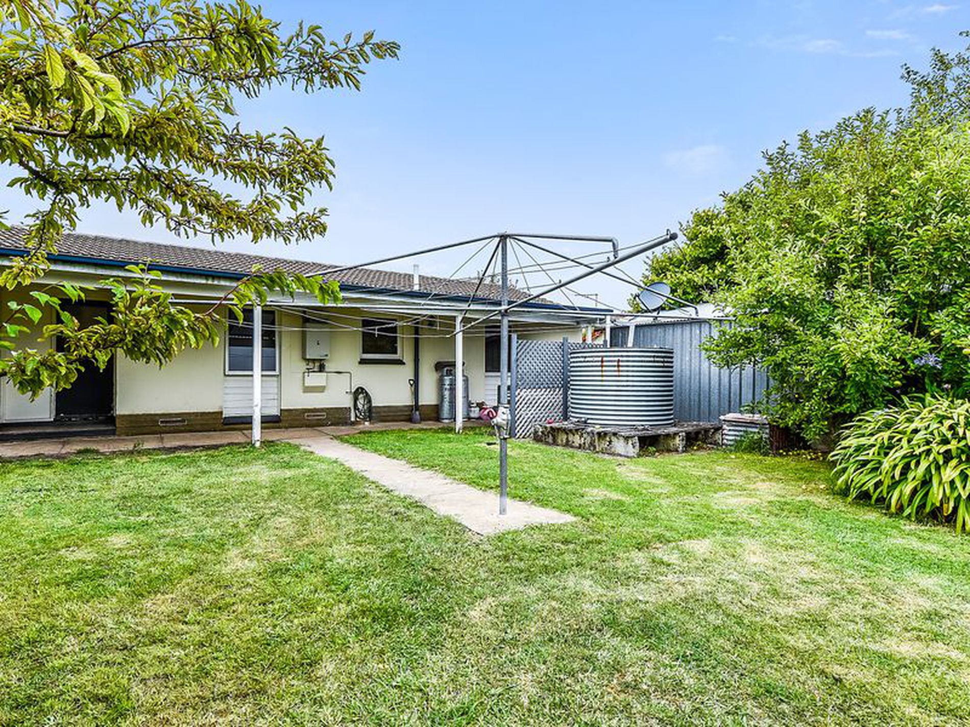 Single bay galv shed in large fully enclosed backyard with variety of fruit trees