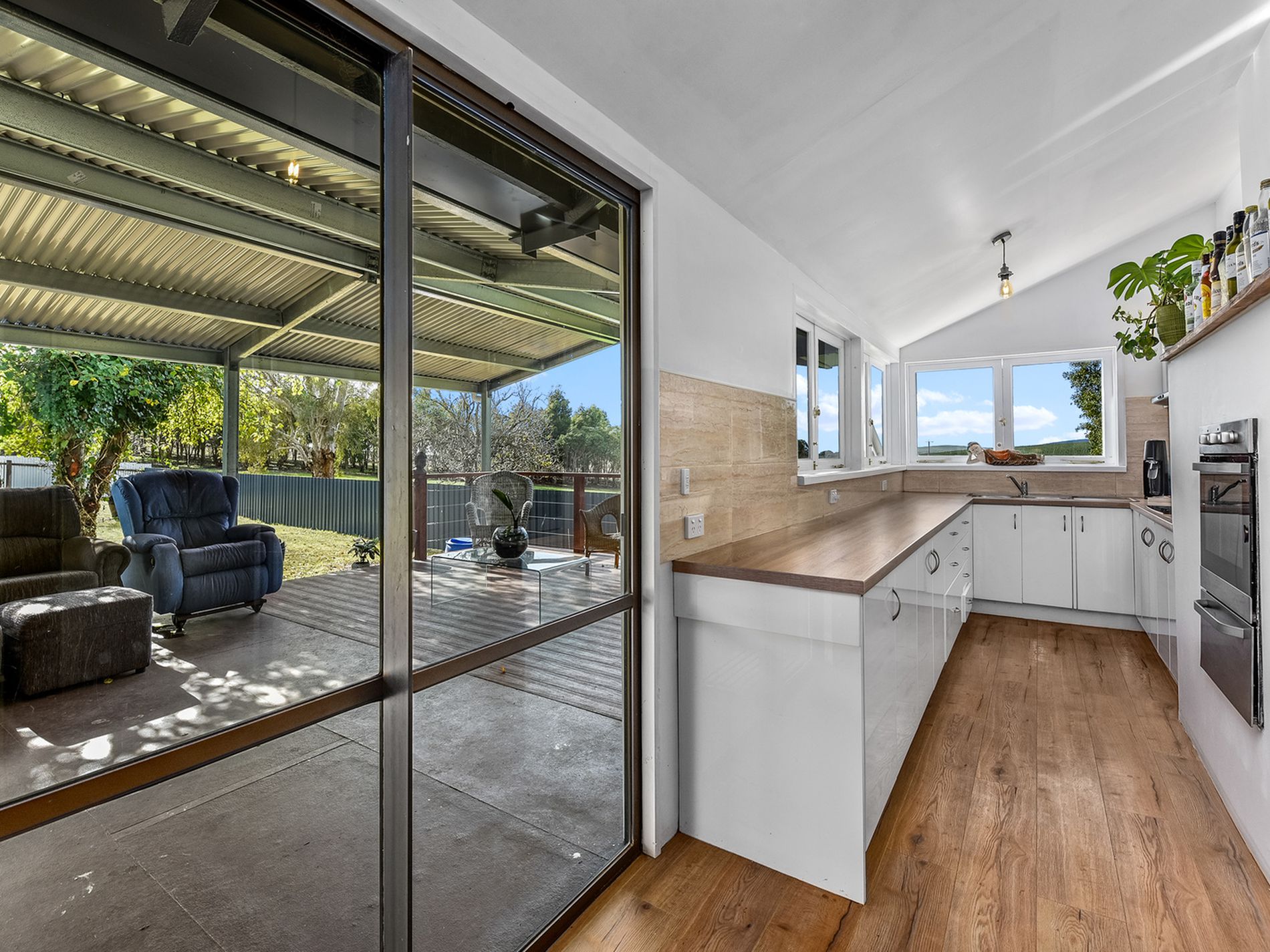 Upon arriving at the home the renovations are apparent. The home shines with it’s new colour bond roof, new cypress pine deck, screening and fresh paint. Entering the home via the front veranda the lounge presents wonderfully with floating floors, slow combustion wood heater, ship lap timber cladding and an elegant chandelier.
