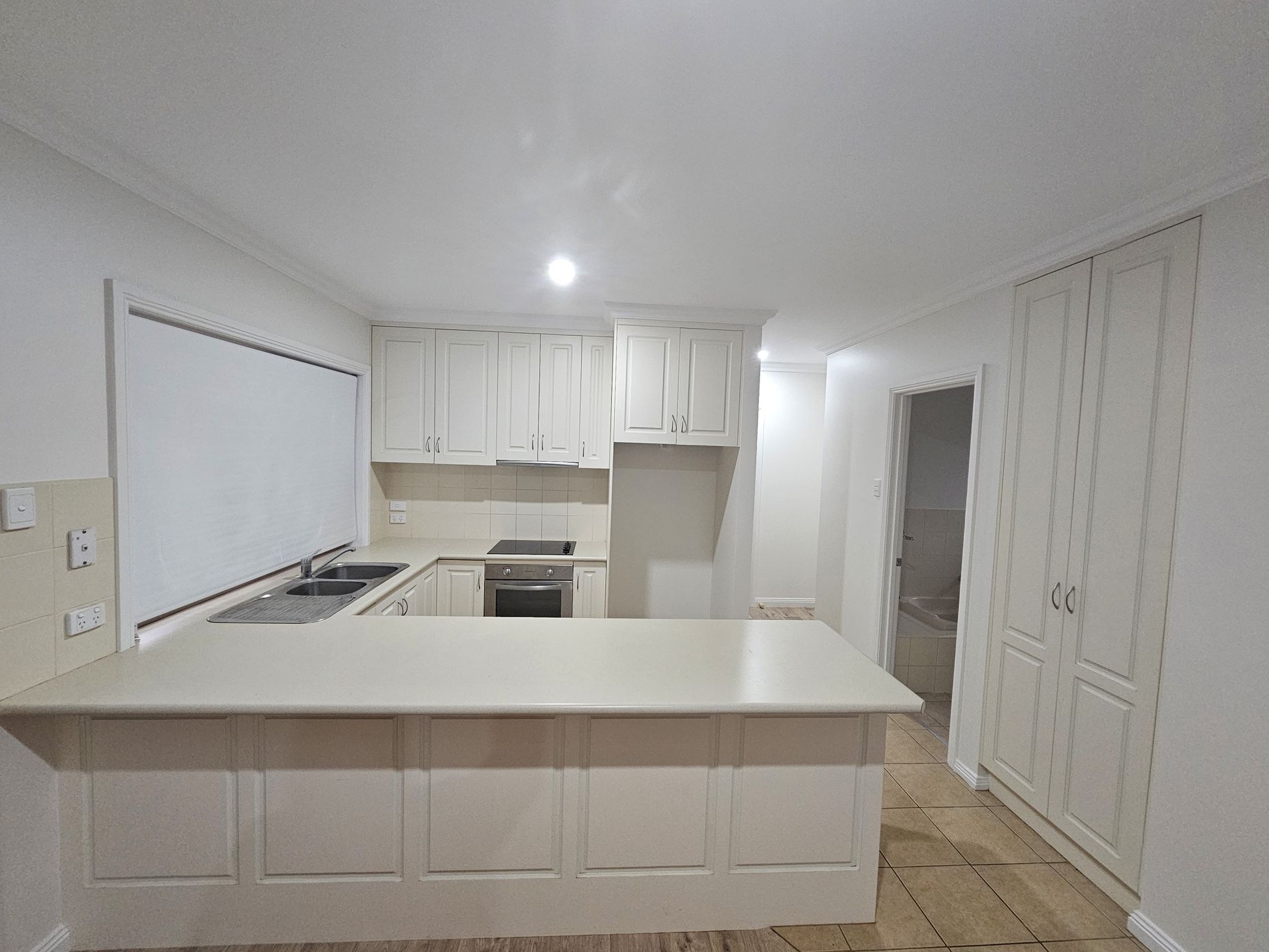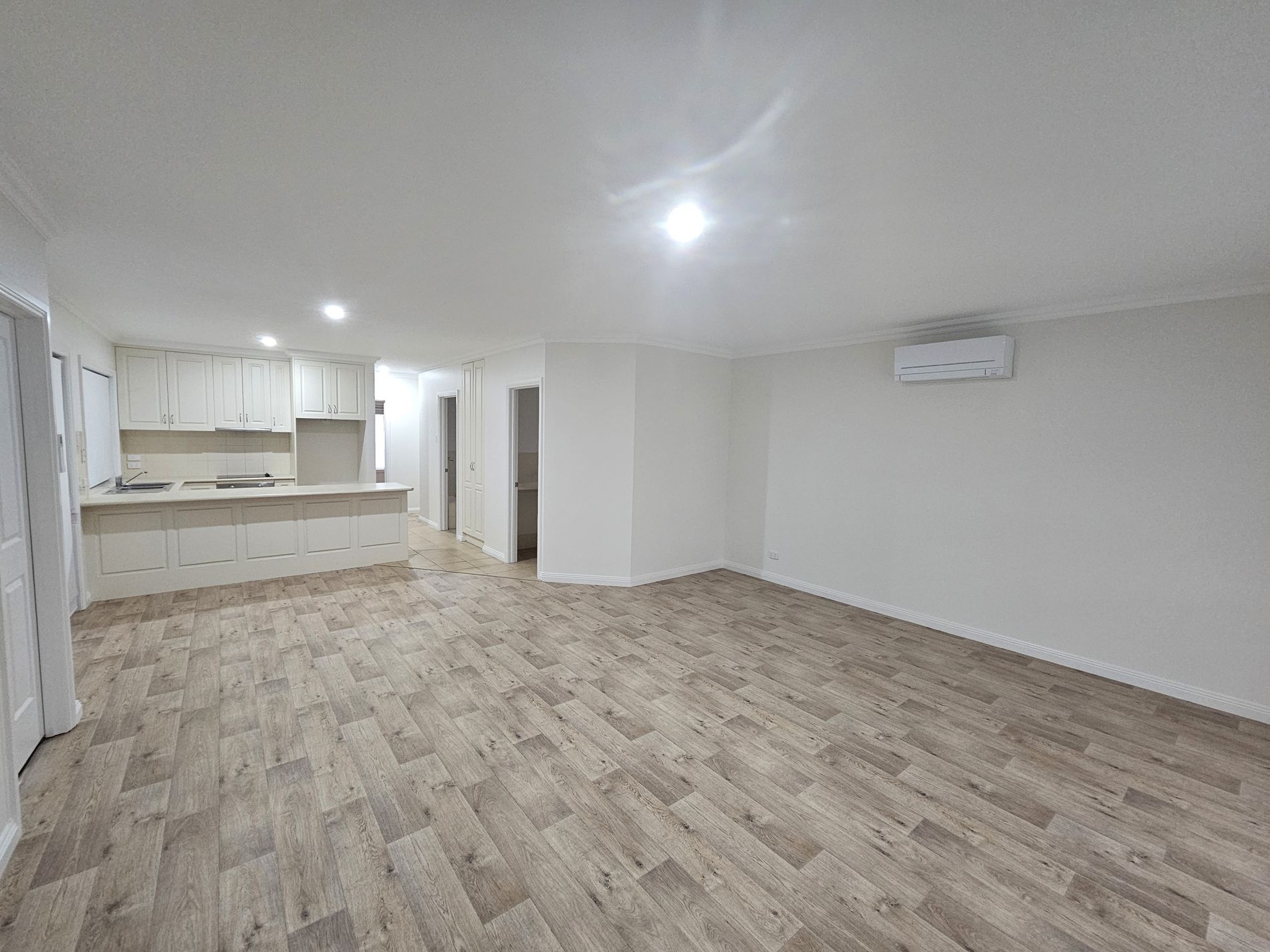 Open plan living/dining/kitchen, compact kitchen with good storage and bench space.