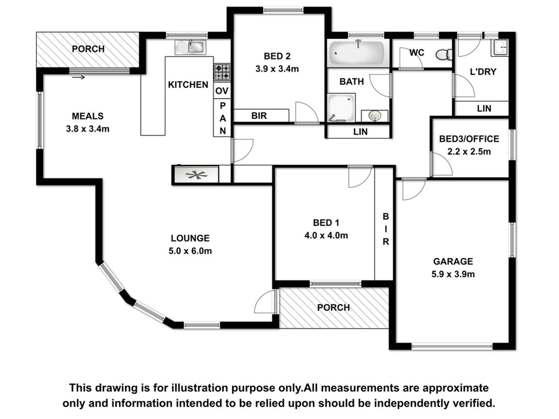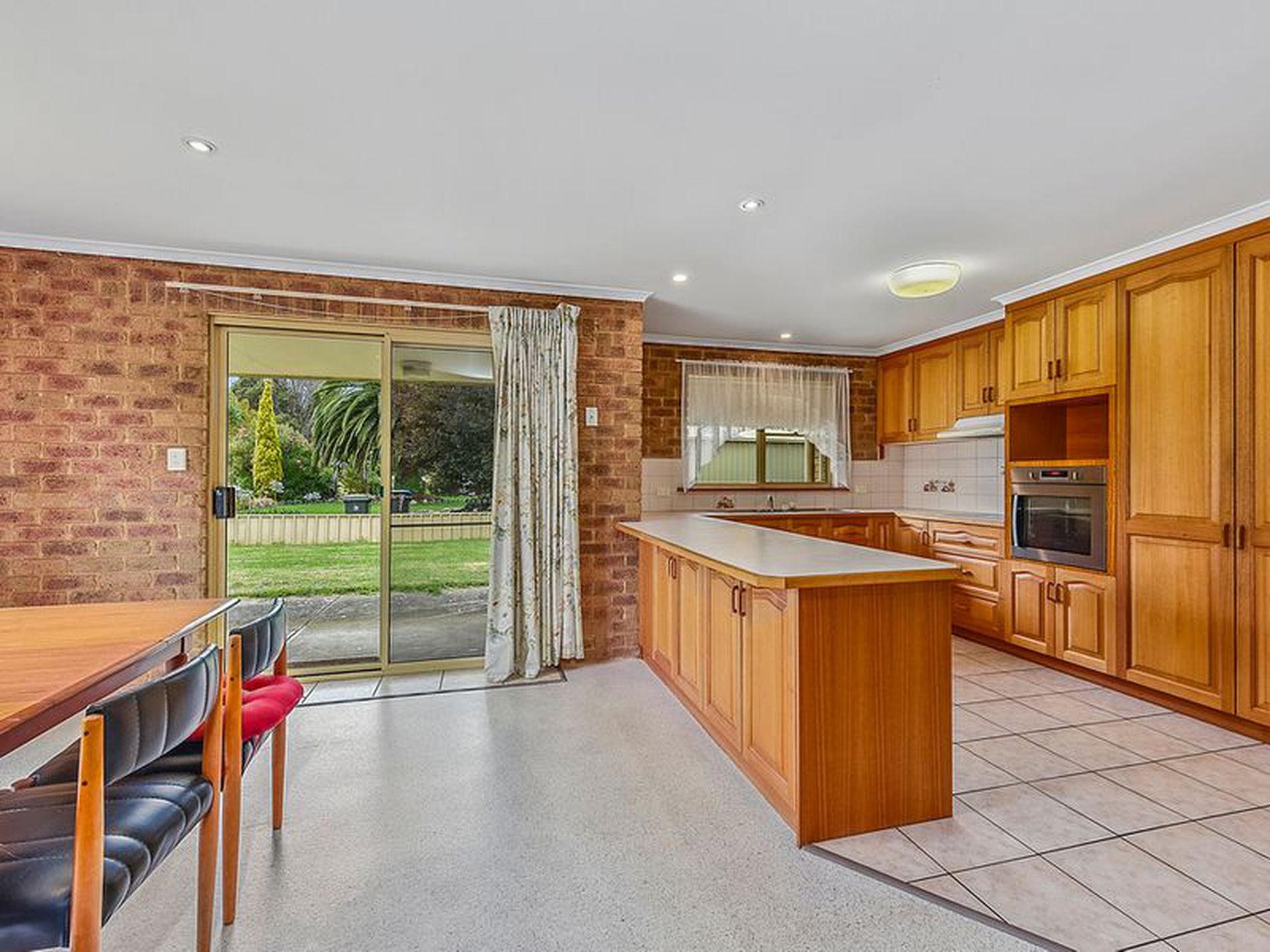 The large dining area has vinyl flooring with sliding doors out to the back verandah and rear yard, the adjacent tiled kitchen has baltic timber cupboards. There is ample bench space, a pantry and modern appliances with a stainless oven and ceramic cook top both electric. There is a wide passage leading to two bedrooms, both with built ins, as well as a designated office space.