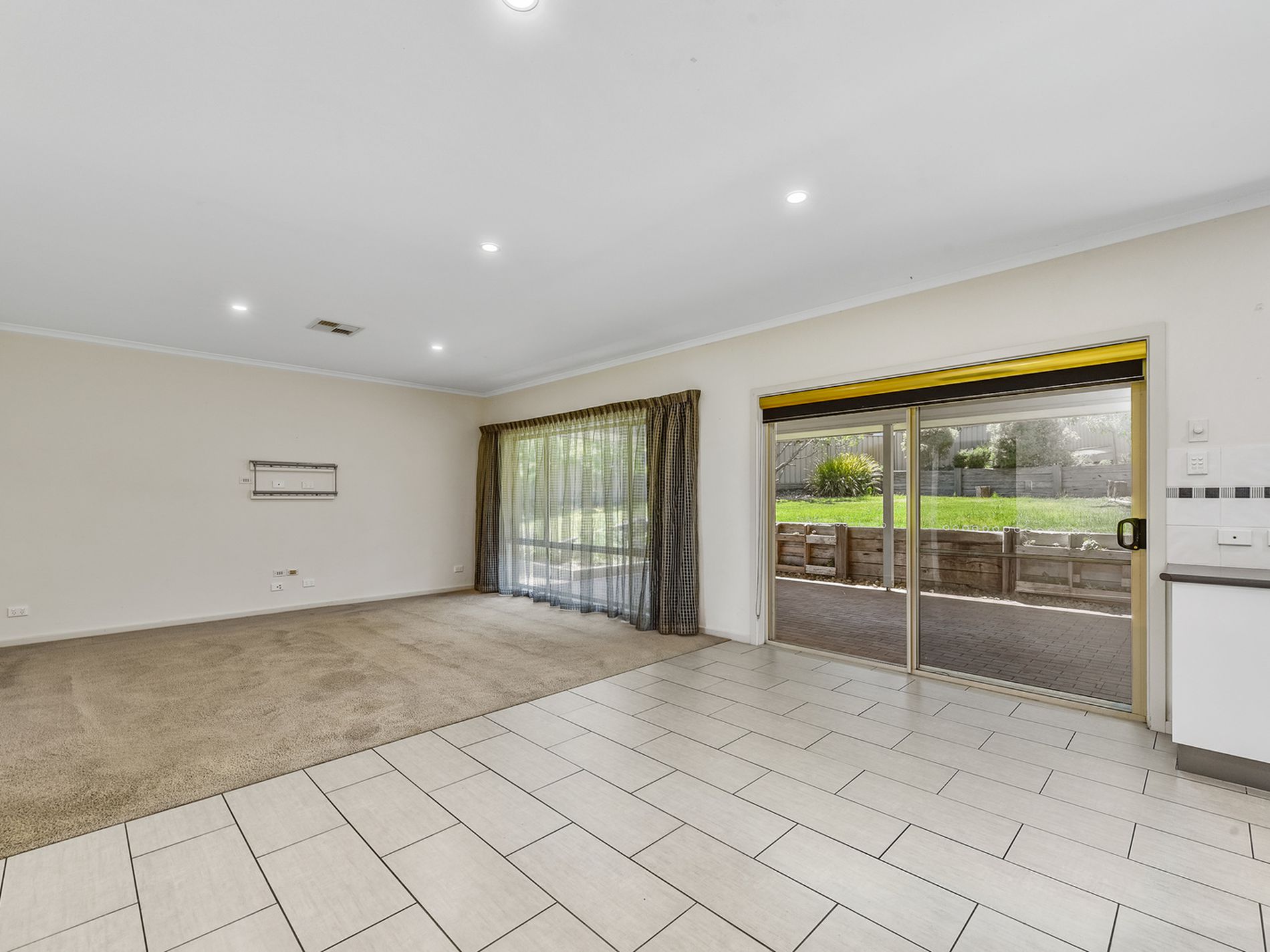 The living space is carpeted and the whole area overlooks the paved pergola space which is accessed through sliding doors.