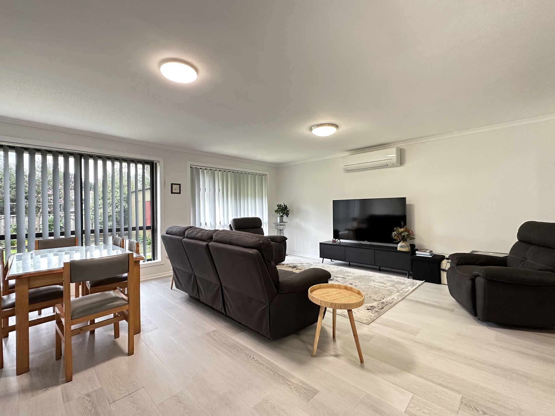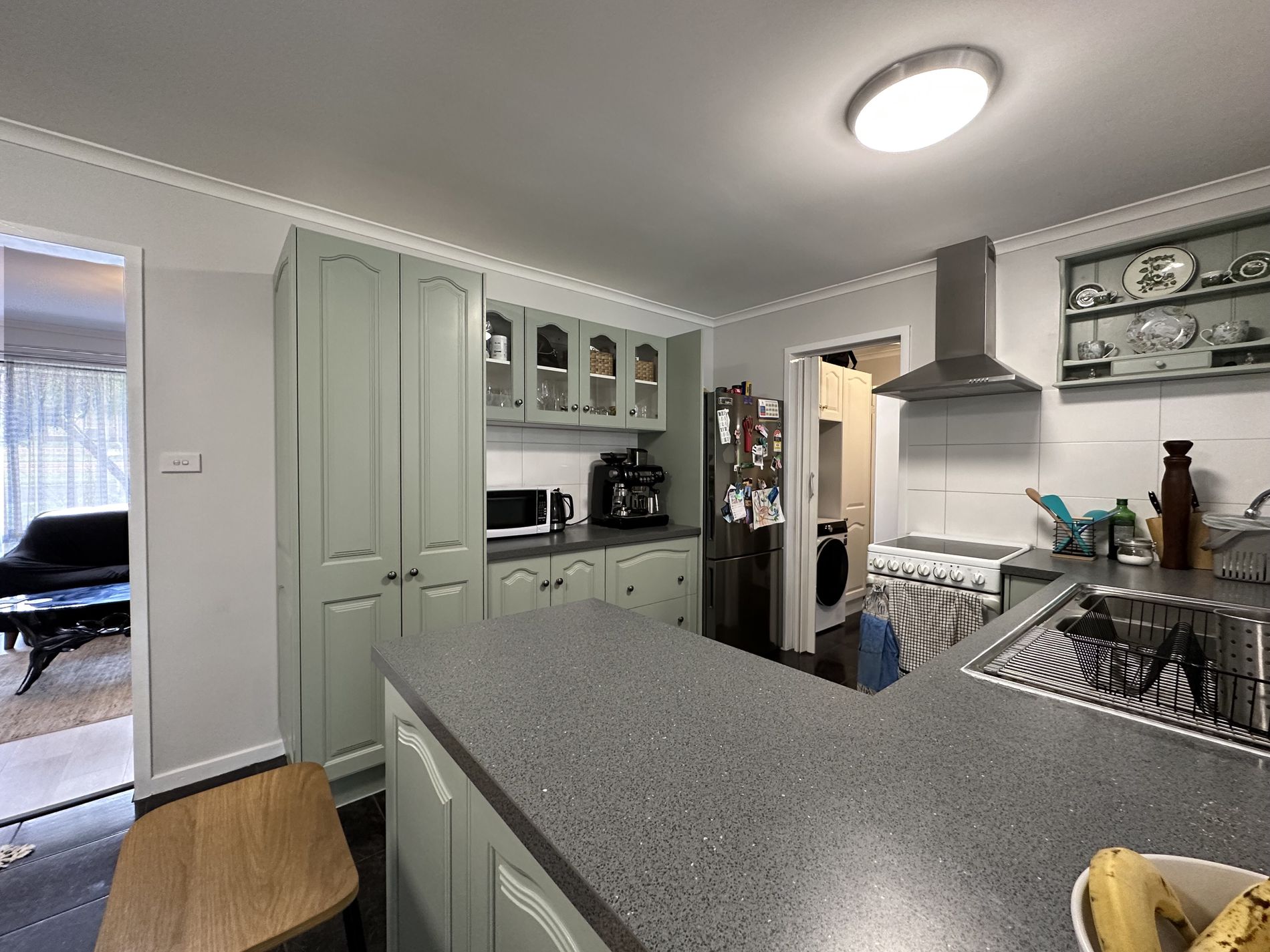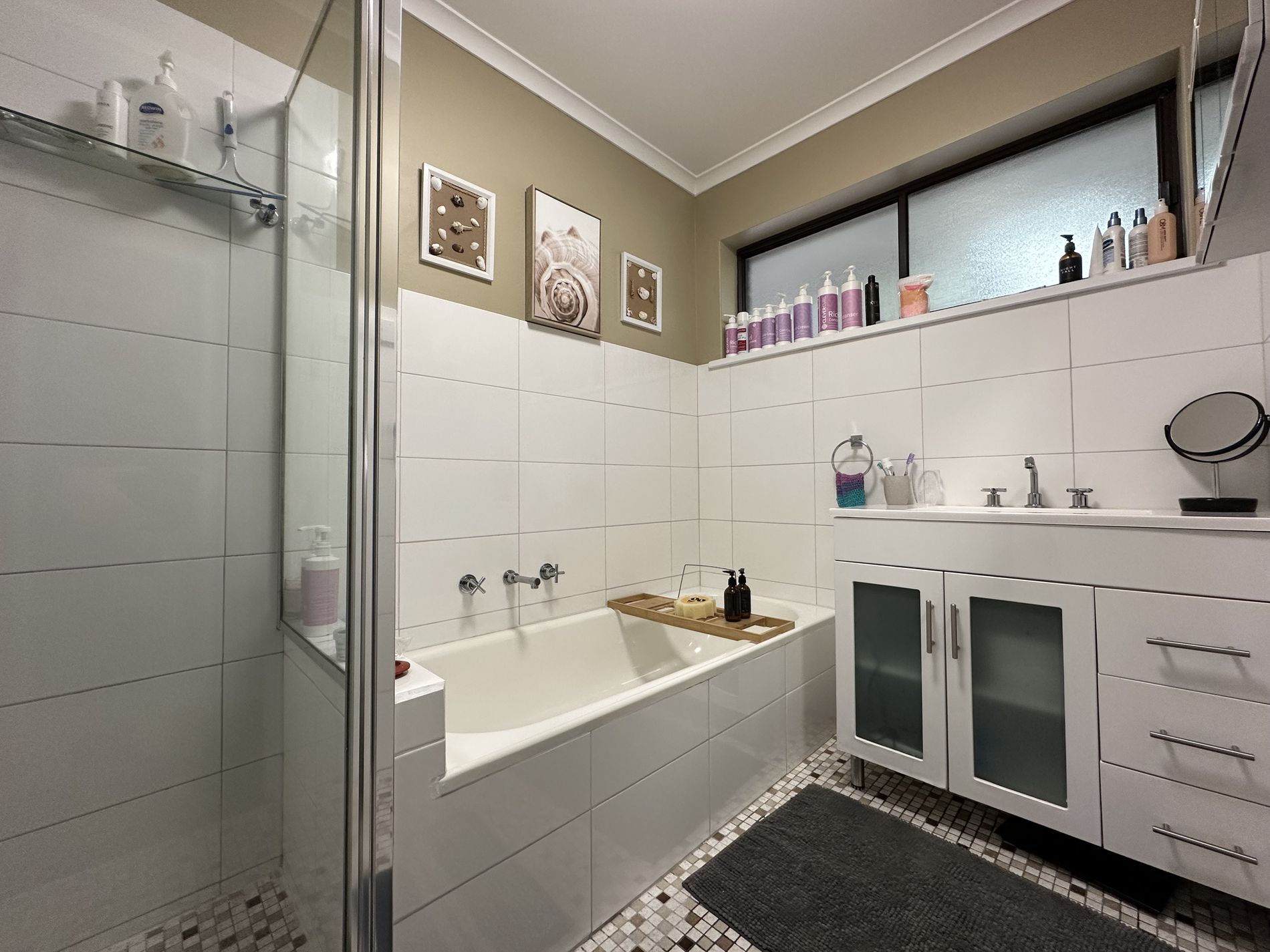 The dwelling accommodates three well-proportioned bedrooms, all carpeted and adorned with curtains. The main bedroom is equipped with a fan for added ventilation. The bathroom features a separate bath and shower, complemented by a new vanity. Additionally, the toilet enjoys its own separate space.
