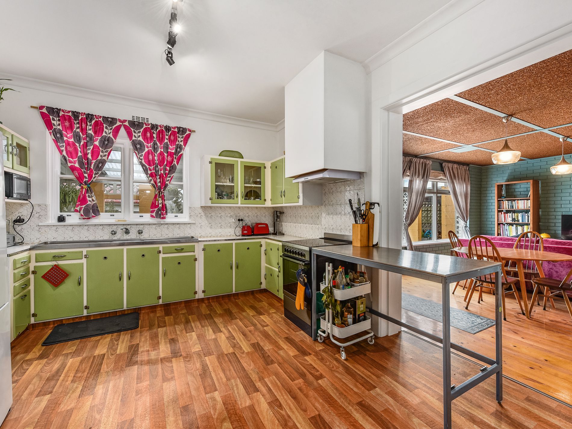 • A large retro-style kitchen serves as the heart of the home, featuring electric cooking, ample storage space, and timber-look vinyl flooring