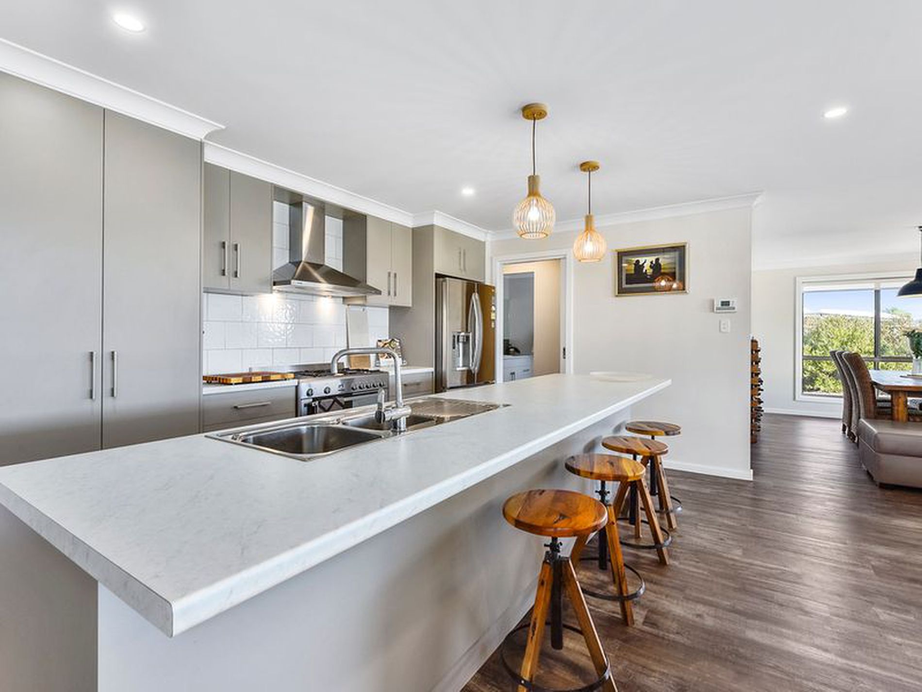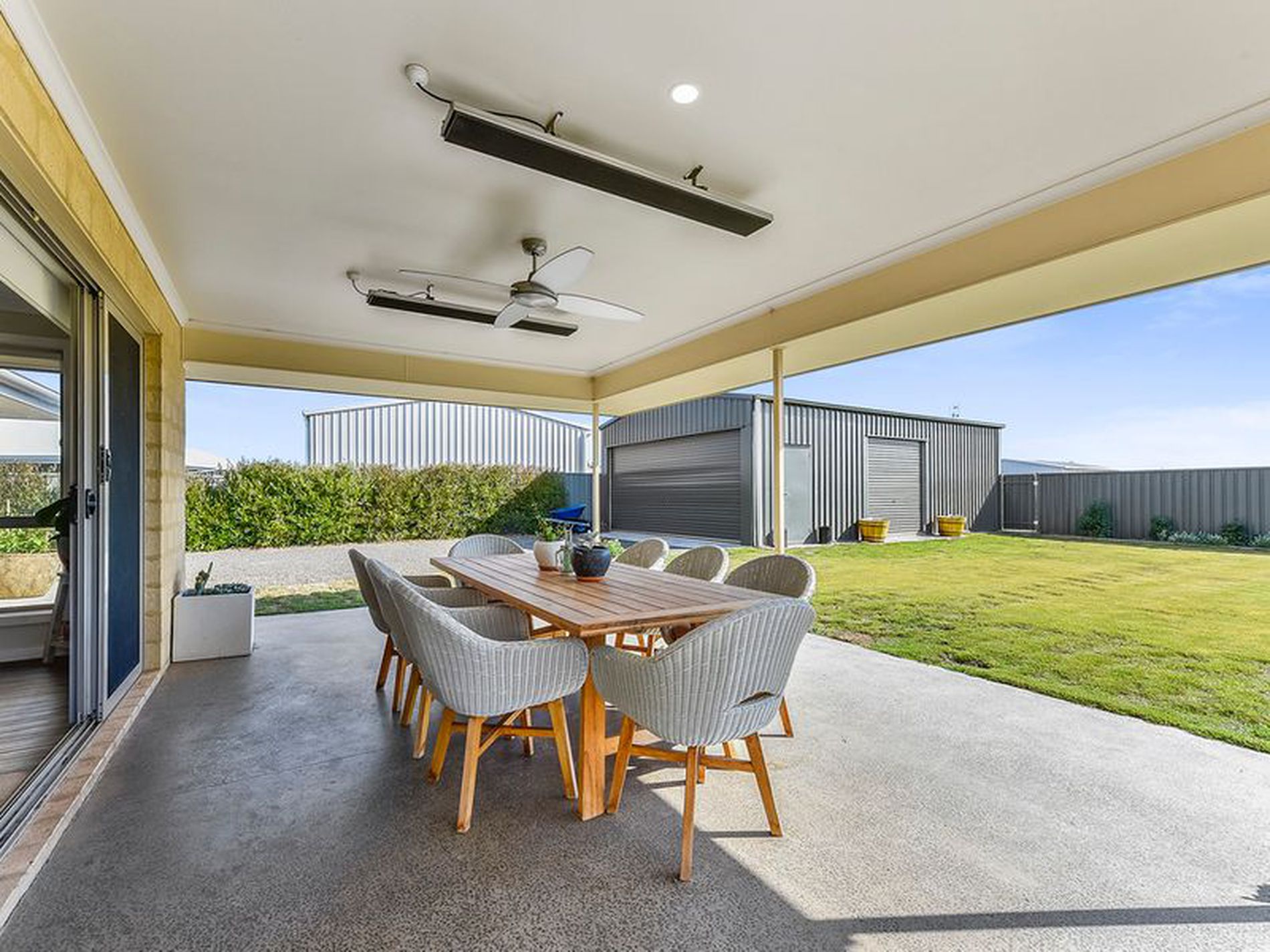 Walk down the hall to the impressive open plan living, dining, and kitchen area. The dining area is big enough for a large family dining table and could seat as many people as you want. The kitchen is light , bright and beautifully finished with quality stainless fittings and appliances. There is a double sink, electric under bench oven and gas cook top, a dishwasher and fully plumbed fridge provides you with drinking water and ice on demand. The huge walk in pantry is a massive bonus and will hide away all of the mess and clutter from your kitchen benches. The island bench overlooks the large family area with double sliding doors that open up onto the undercover pergola. A beautiful entertaining area with polished concrete floor and heat strips and a fan for your comfort.