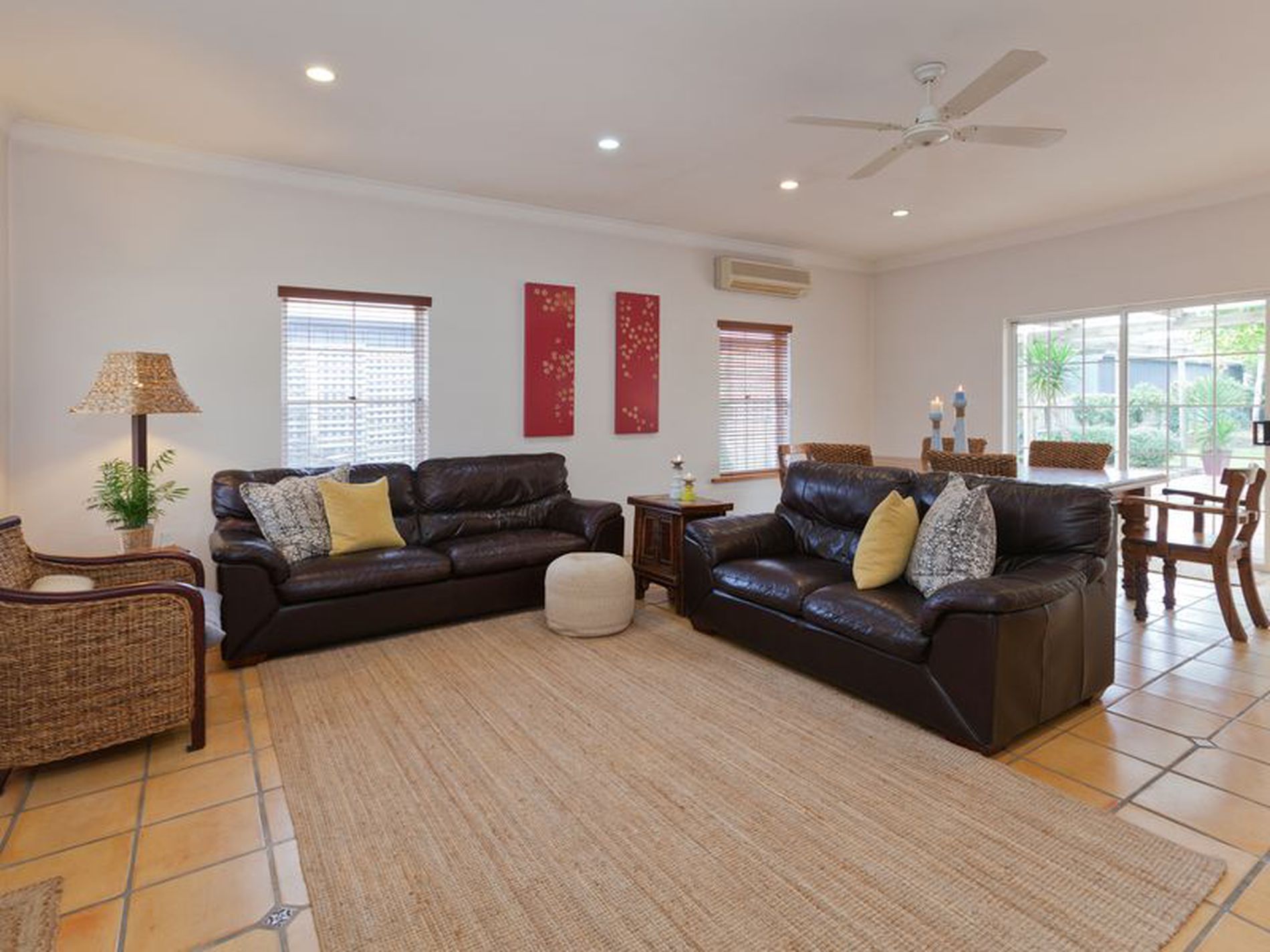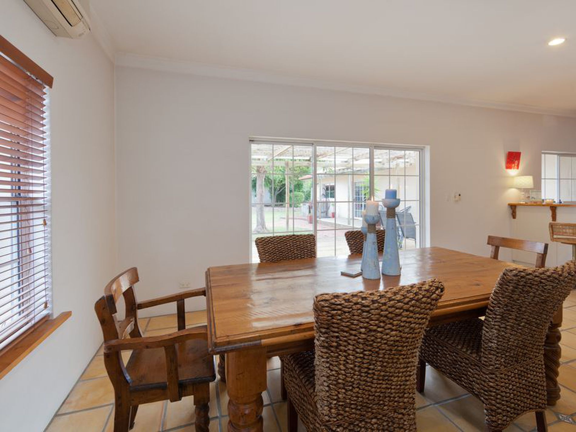 The main living area is a lovely open space incorporating kitchen, dining, living. You have a Reverse Cycle air conditioning unit here for heating and cooling, a ceiling fan and a feature built-in wall unit which adds character. Dining is adjacent with colonial french sliding doors leading to the Alfresco out door living space.