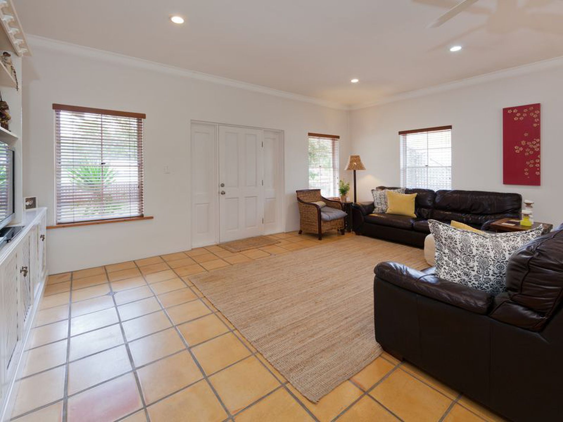 The Main bedroom is massive. It is tiled with a french style sliding door leading to the outdoor alfresco space. This area has been added and it is private and close to 2nd bathroom. If not needed as a bedroom it would make an ideal office/work space to work from home, a teenagers space or hobby room. This space also has door access through to garage as well.