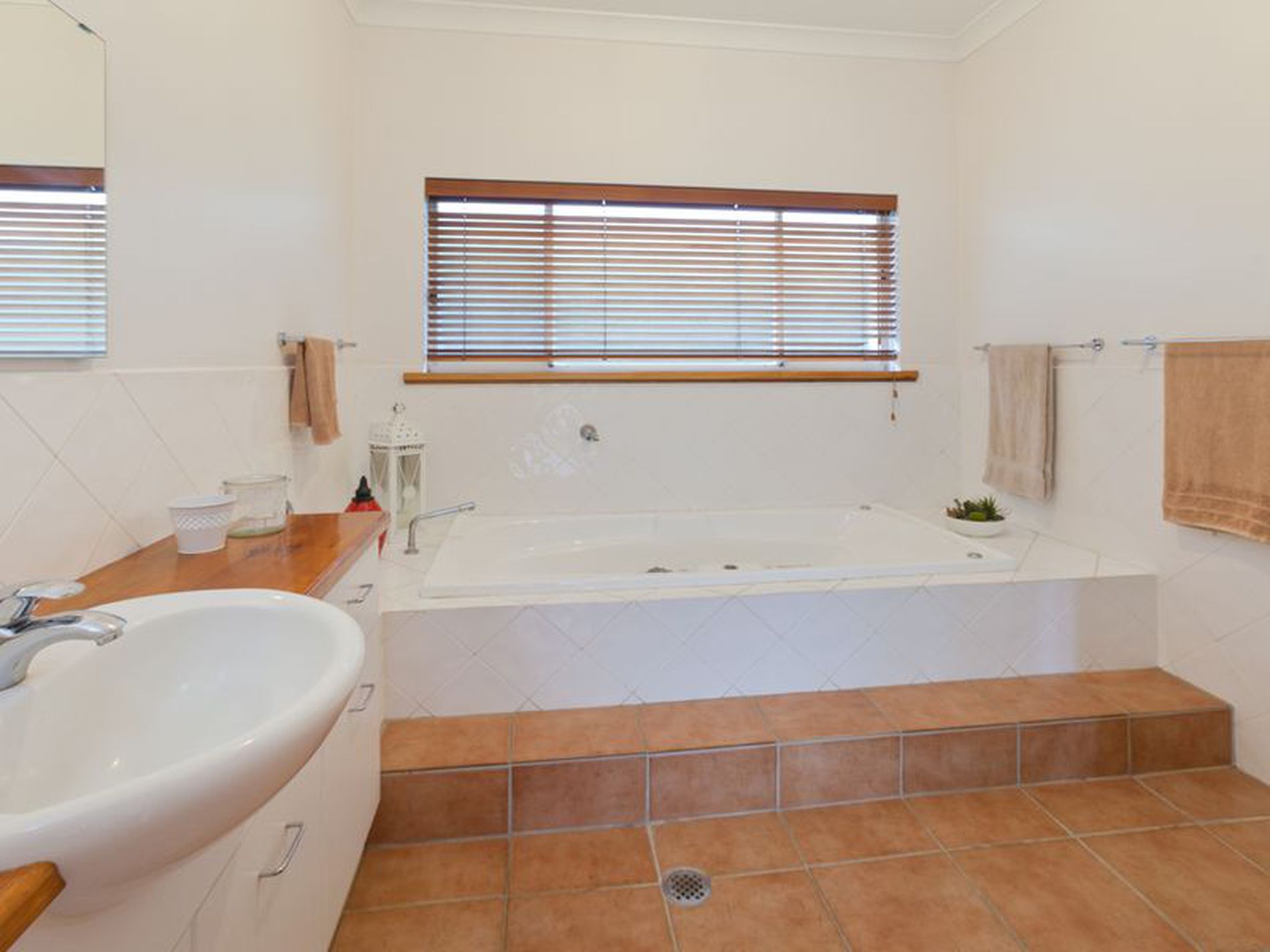 The main bathroom is light, bright and spacious. It has a Spa bath, shower and vanity, a lovely space to relax and forget about the stresses of the outside world.