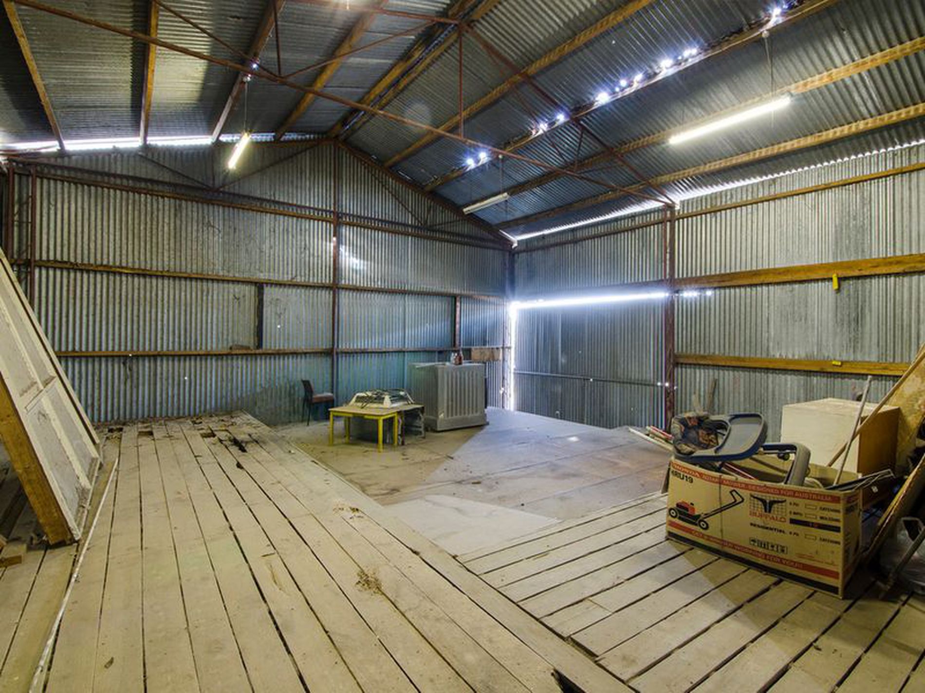 - The rear storage shed is of galvanized iron construction and in need of some repair.