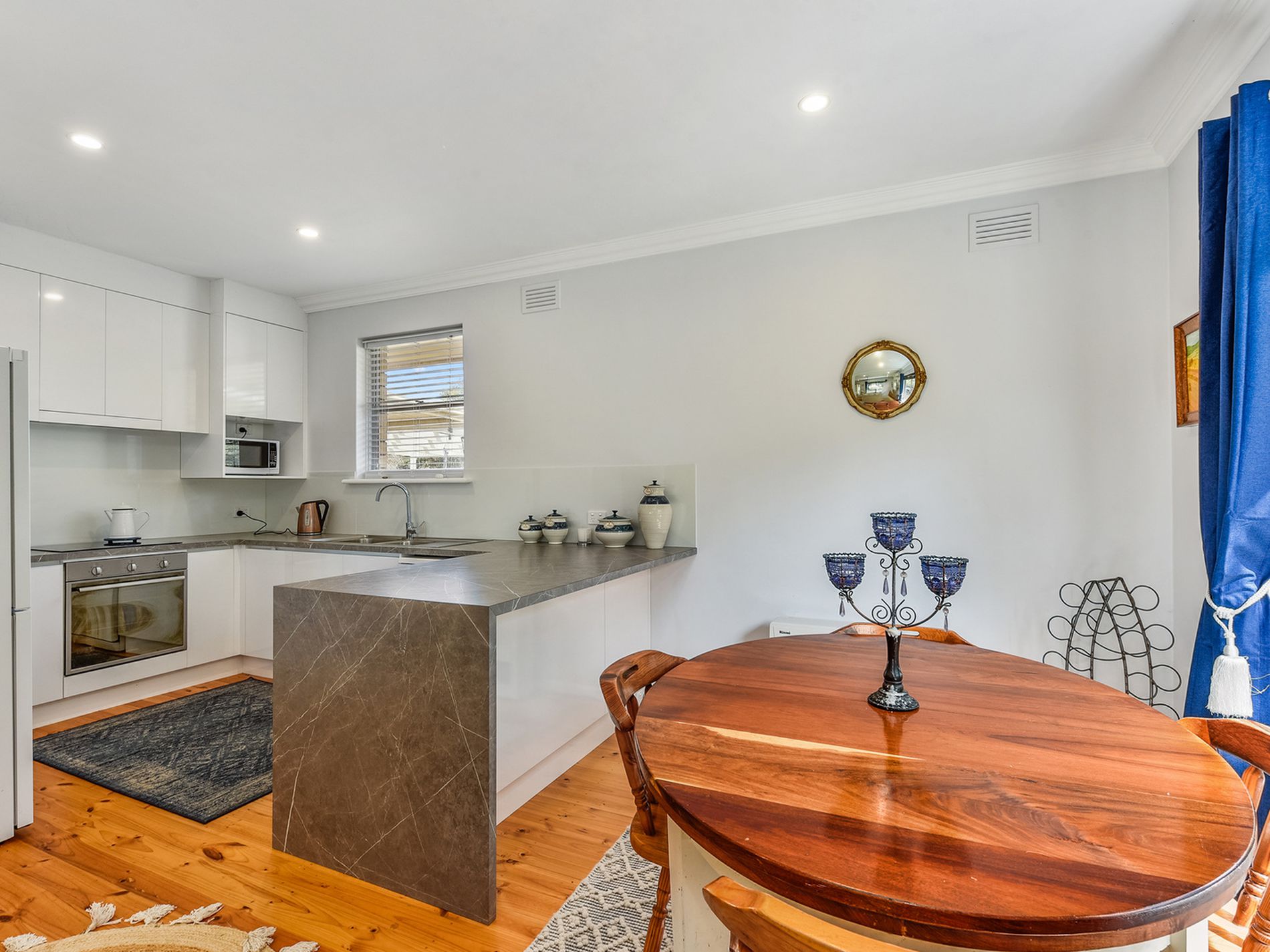 The interior is designed to maximize natural light, with expansive windows creating a light and airy ambiance. The open plan living area, with polished floorboards, seamlessly integrates a comfortable living room, a well-appointed kitchen, and a dining area. The recently renovated kitchen showcases a contemporary island breakfast bar, providing ample storage and preparation space. Electric cooking and a dishwasher make food prep and clean up easy.