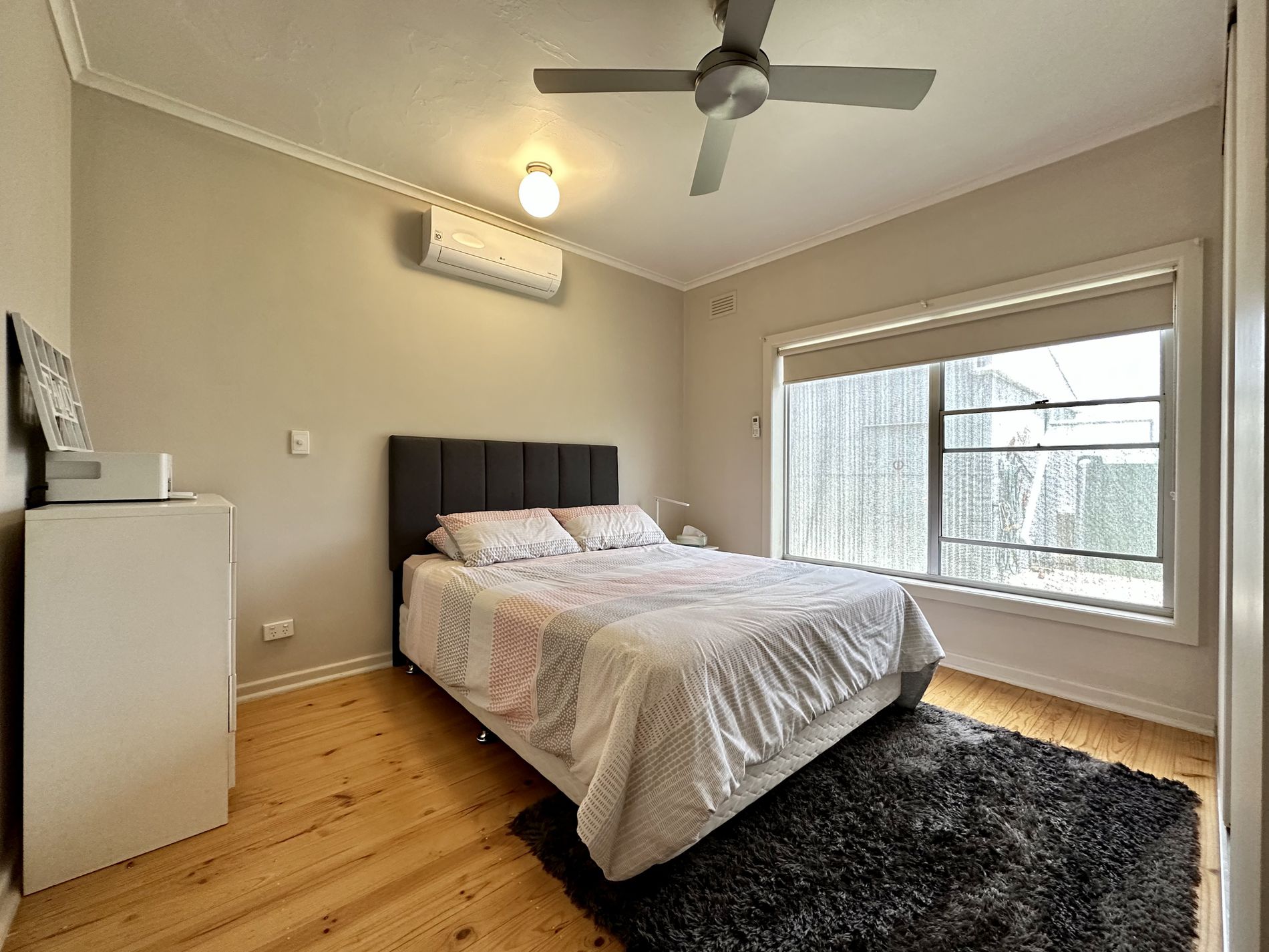 The second bedroom includes polished floor boards, a ceiling fan and yet another split system air-conditioner.