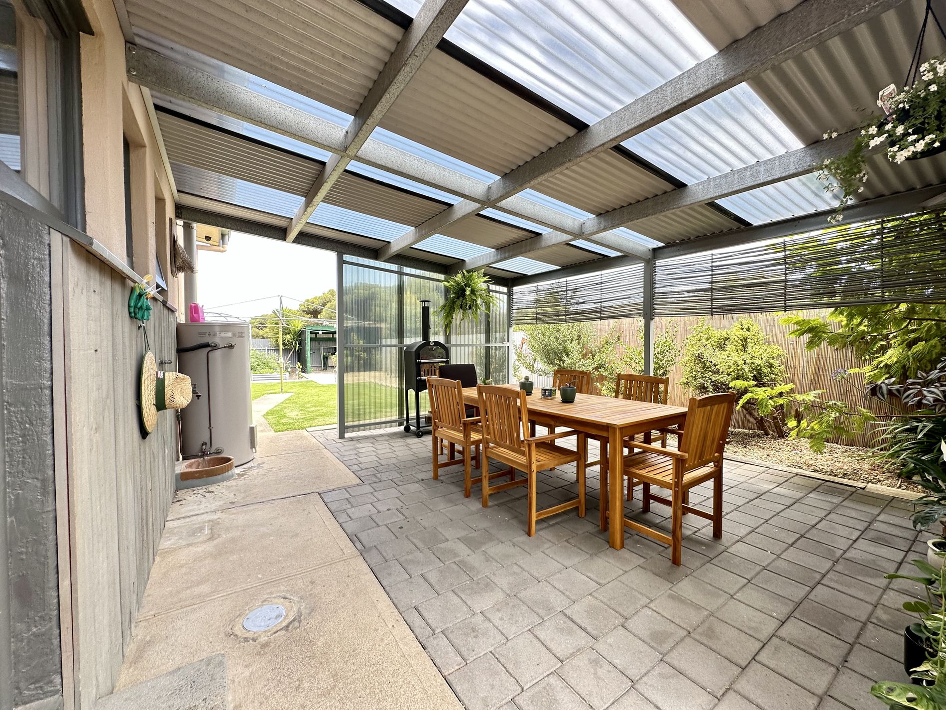 The home features a L-shaped lounge-dining area with beautiful polished floor boards and large windows filling the room with natural light. A split system air-conditioner takes care of your heating and cooling needs.