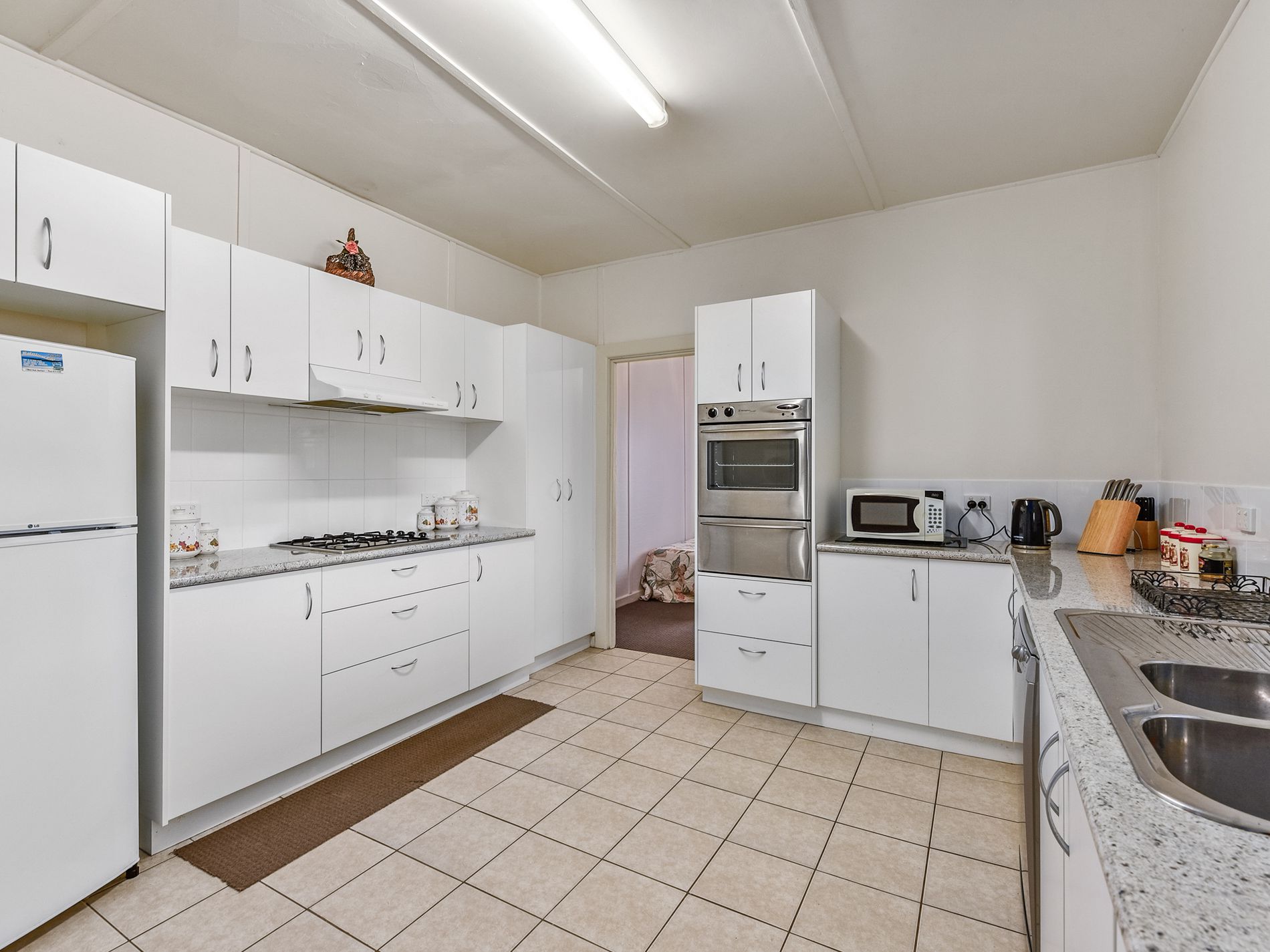 Adjacent to the dining area is the spacious tiled kitchen, complete with electric cooking facilities, a dishwasher, and ample cupboard and bench space for culinary preparations and cleanup.