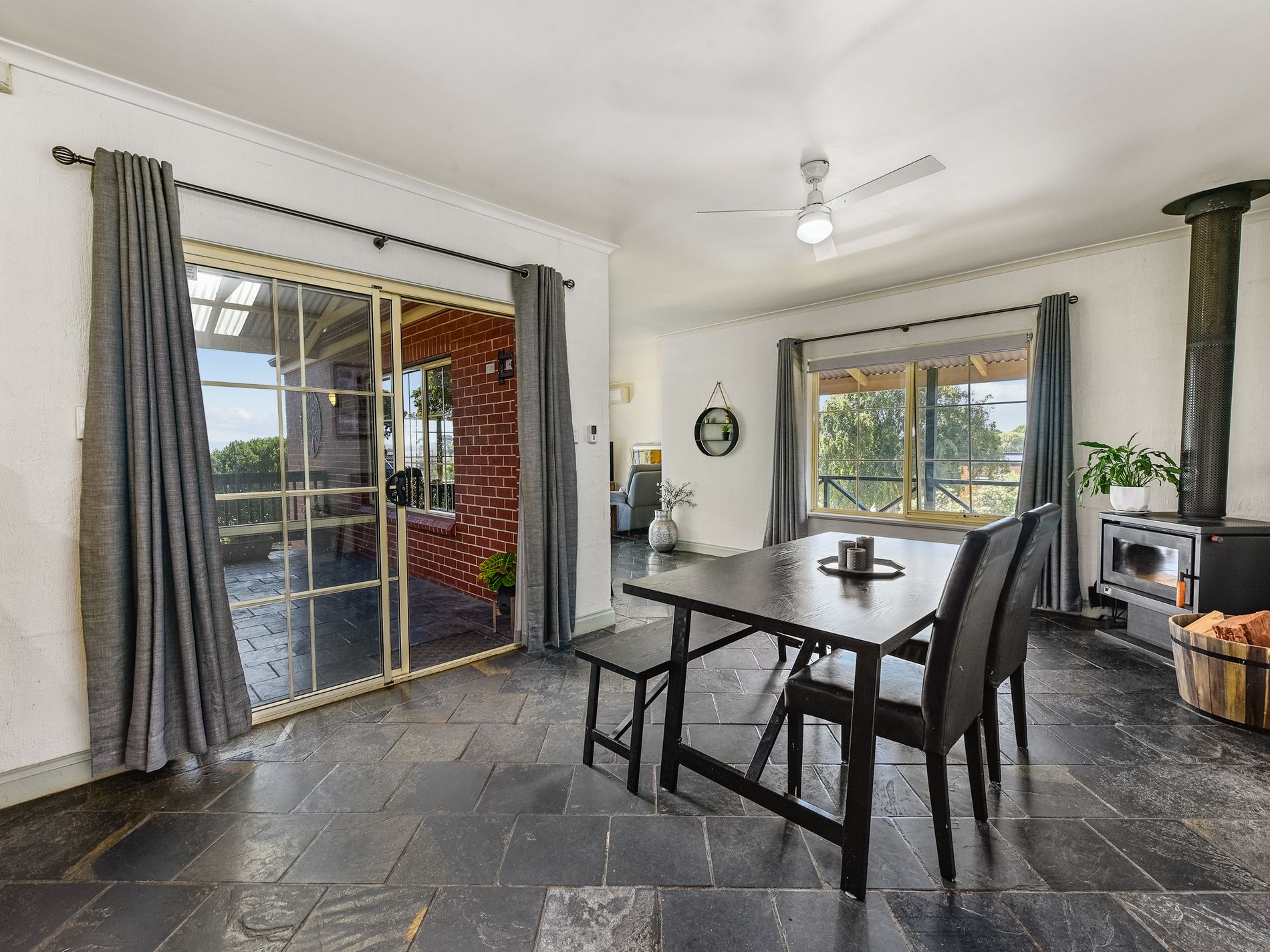 Equipped with modern conveniences, the kitchen features timber cabinetry, a corner pantry, a fridge alcove, a new dishwasher, double sink, and new gas cooktop with an under-bench oven. Climate control is ensured with a reverse cycle air conditioner and a slow combustion wood heater, while doors lead seamlessly to the outdoor area.