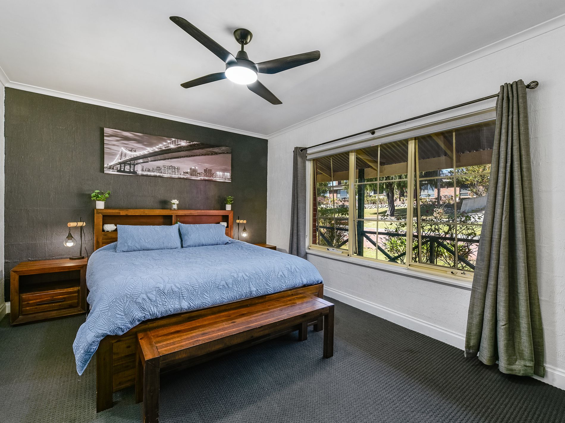 To the left, the converted garage has been transformed into a lengthy second bedroom or an additional living area, providing flexibility to suit your lifestyle. Continuing past the stairwell, the open-plan kitchen, dining, and family living area beckon with slate flooring and French windows that overlook the pergola/balcony and the scenic north farmland.