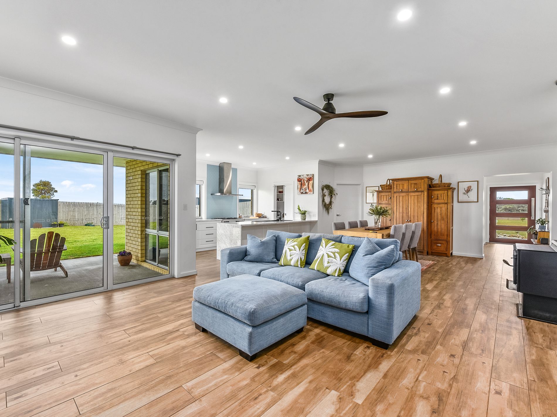 Step inside to discover a breathtaking open-plan living area adorned with coastal porcelain tile flooring, serving as the heart of the home. The kitchen boasts sleek waterfall benchtops, a lavish walk-in pantry, and a spacious breakfast bar, ideal for both practicality and elegance. Equipped with a range of modern appliances including a 900mm electric oven, gas hotplates, Miele dishwasher, and Stone double sink, this kitchen is a chef's delight. Sliding doors seamlessly connect the living area to the alfresco dining space, perfect for entertaining on balmy summer evenings, while a slow combustion wood fire ensures warmth and coziness during cooler nights. The living room features day/night blinds and a ceiling fan for added comfort.