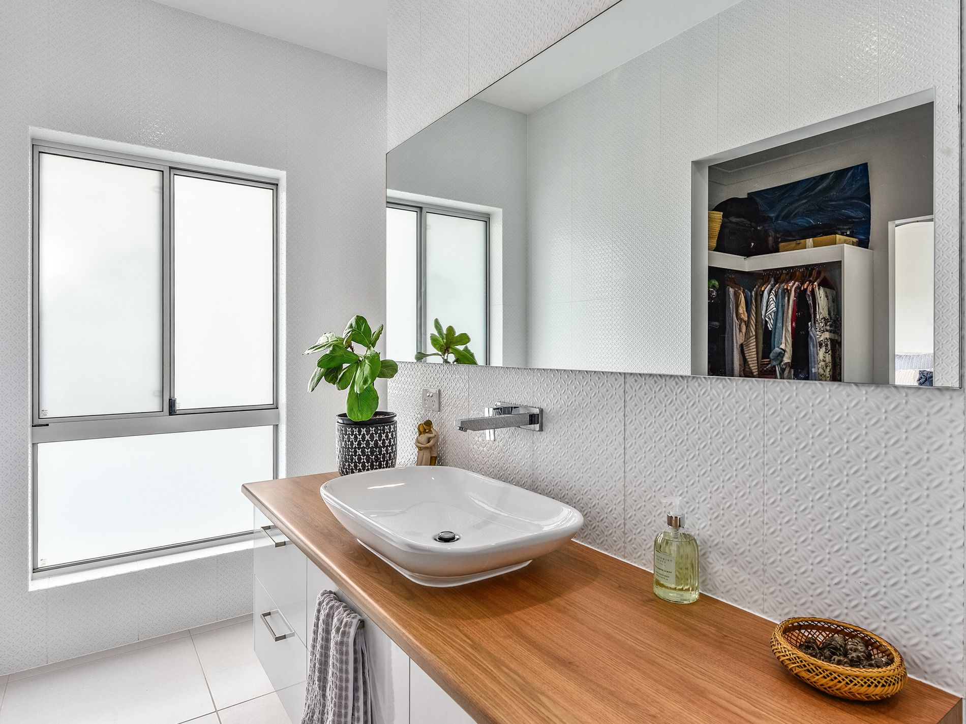Four generously sized bedrooms offer plush carpeting, blinds, and ceiling fans, with the main bedroom boasting a large walk-in robe that leads to a modern ensuite complete with a shower, vanity, and toilet. The main bathroom exudes sophistication with its timber vanity, raised sink, and ample storage, complemented by stunning textured tiles and a spacious mirror. Additionally, a study with a built-in desk provides a convenient workspace, with sliding access to the outdoors.