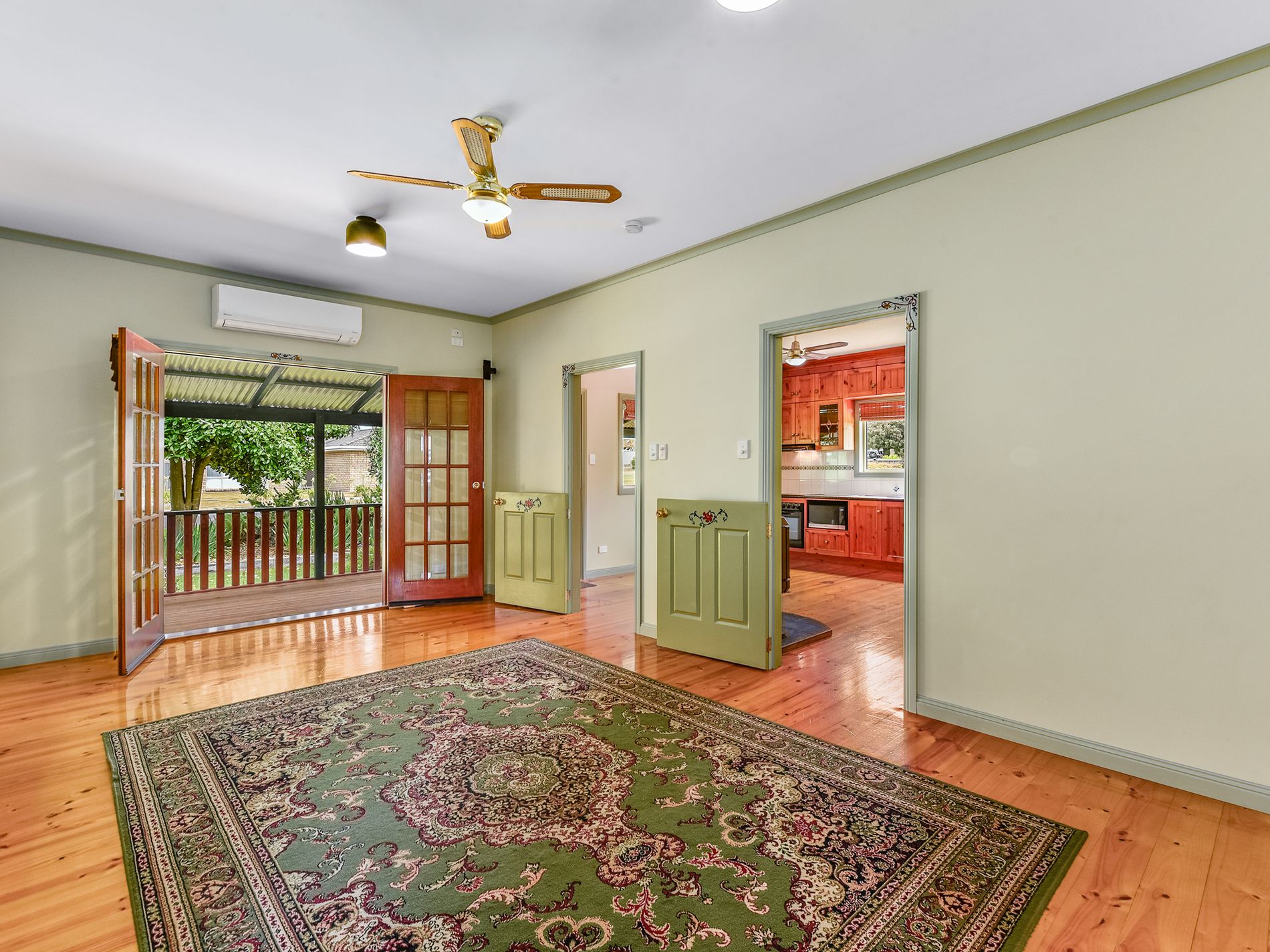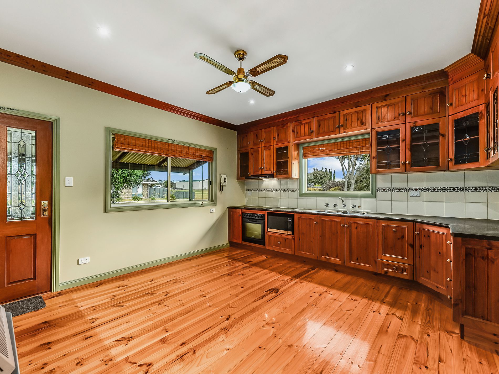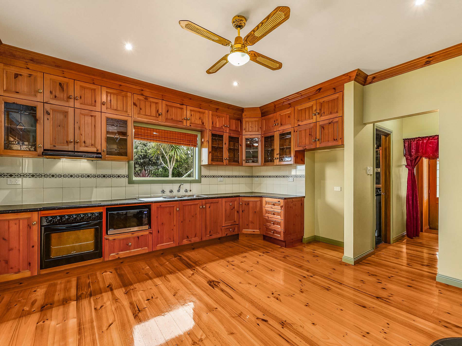 Through to the kitchen, and those wonderful timber floor continue. The kitchen is a chefs delight with all electric cooking, plenty of bench space and storage. More storage can be found in the hall pantry. A slow combustion wood fire cleverly located centrally in the kitchen will keep the whole house cosy in the winter months. Yet another door leads to the front deck for ease of access.
